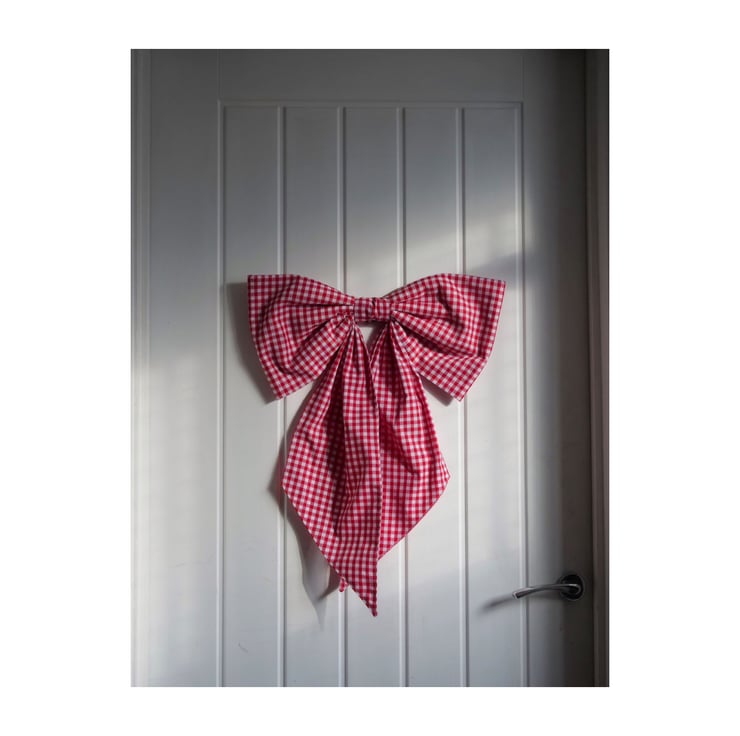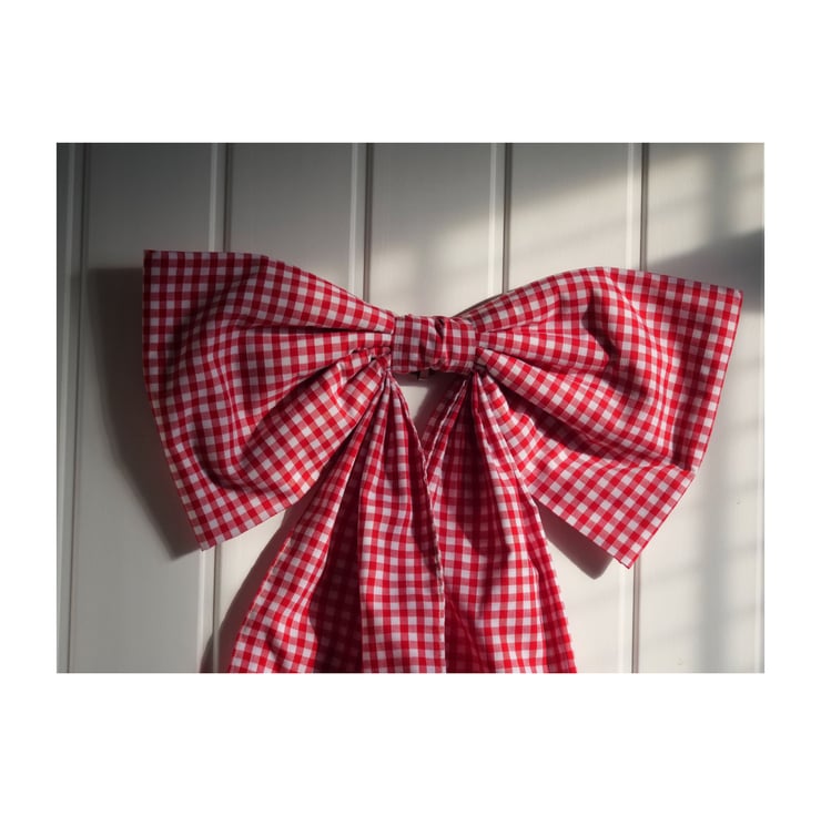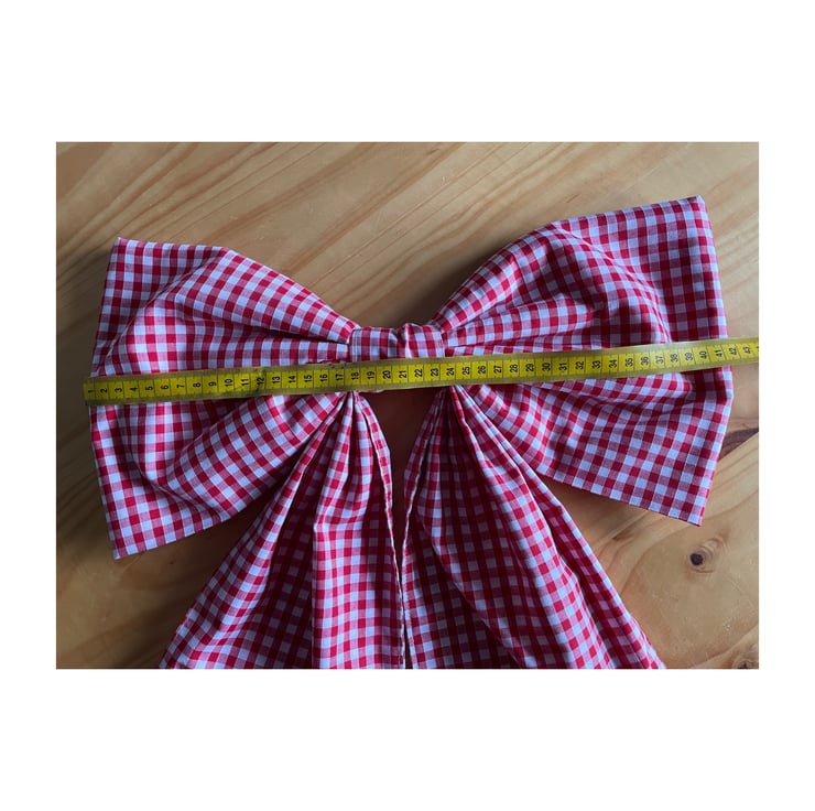 Cute oversized bow. It is approx 16.5” wide and 22” high. The top of the bow is supported with cotton wadding to keep a nice shape. It can be hanged on a wreath or a wall.