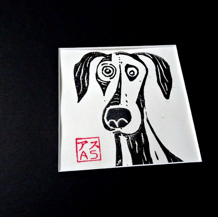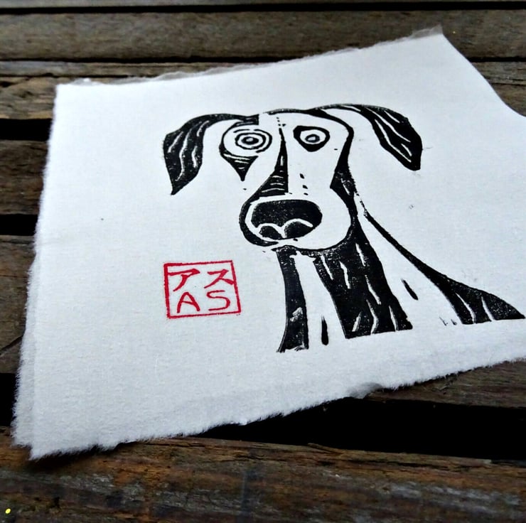 He was hand carved in lino before being printed in black oil based ink onto a sheet of Sumi rice paper which gives a lovely texture and slight creamy colour to the print.