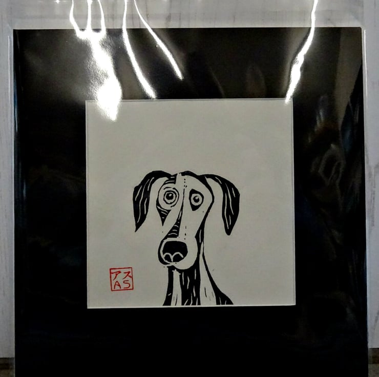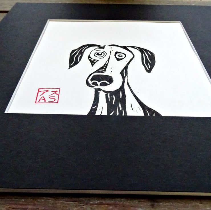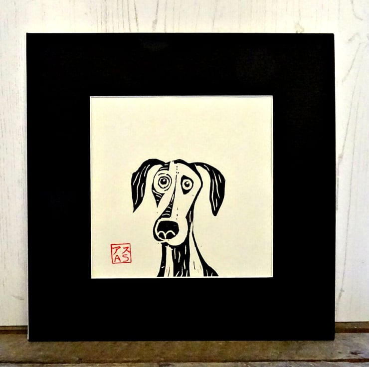 He was hand carved in lino before being printed using oil based black ink onto Sumi rice paper which gives a lovely texture and slight creamy colour to the background.