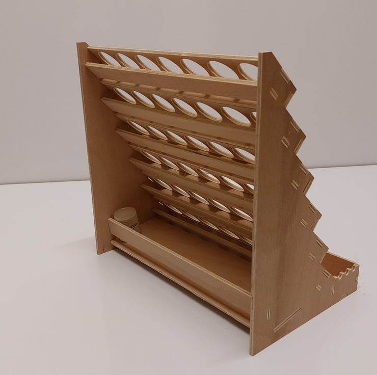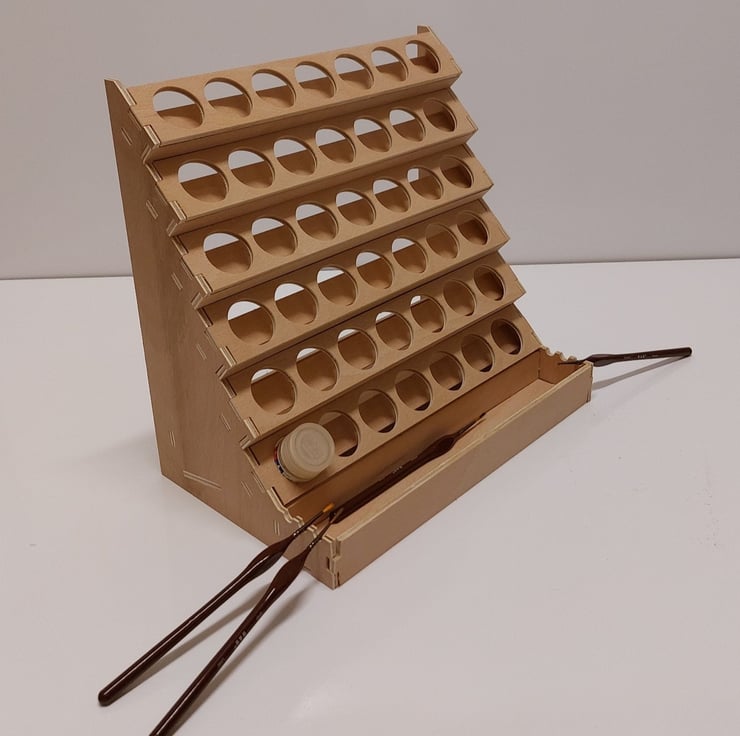 Stand holds 42 Paints with a small container on the front and cutouts for brushes on the both side