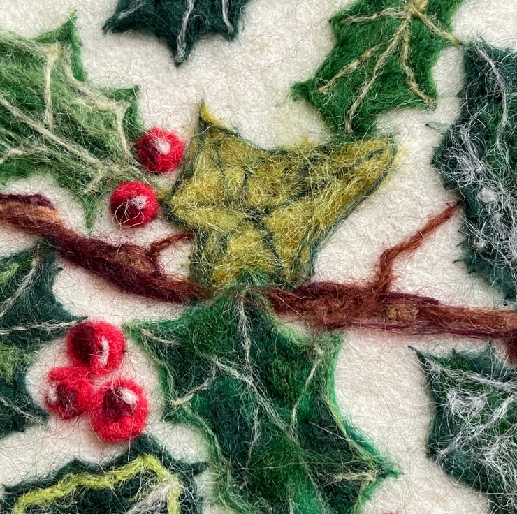 Each of my felted pieces are inspired by the wildlife and landscape around the UK. The holly and ivy piece celebrates the winter foliage that lines hedgerows and reminds us that the festive season is coming.