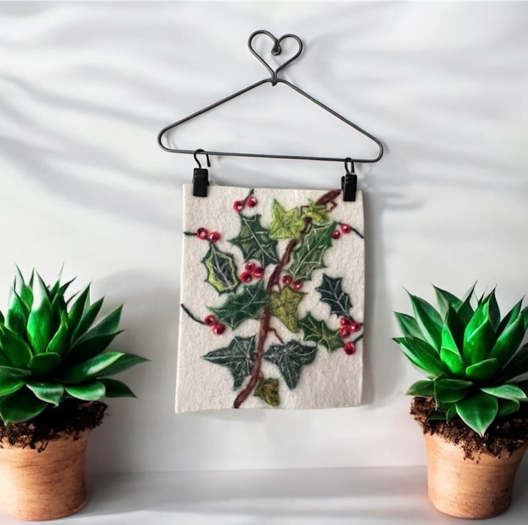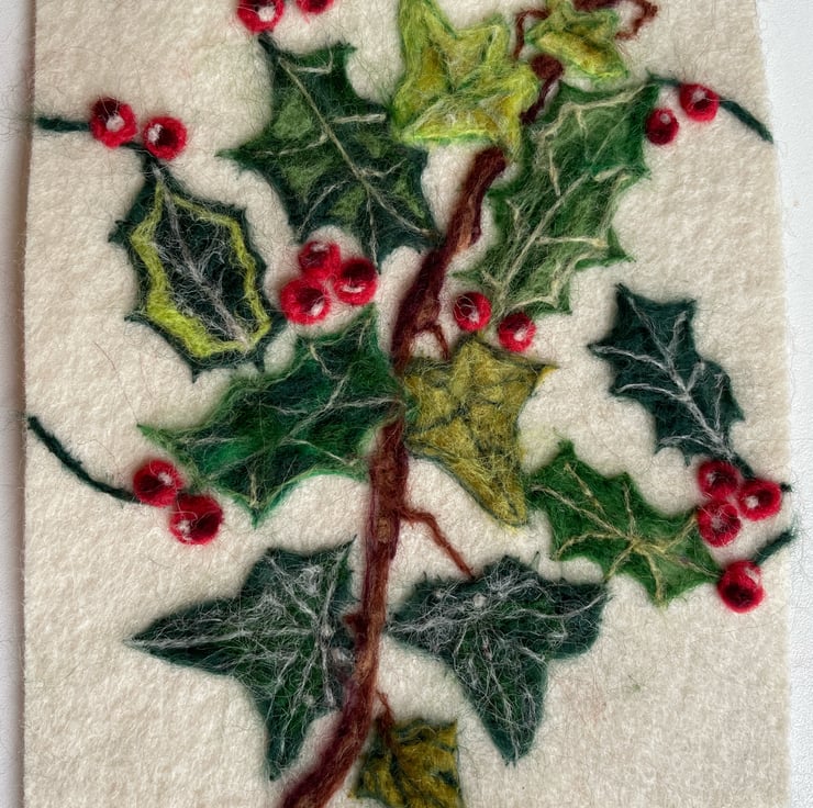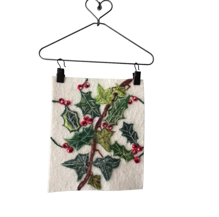 A hand-felted holly and ivy artwork crafted from merino fleece.