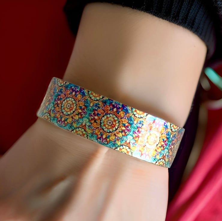 This is a cuff bracelet which I have handmade with a mandala design in attractive orange and teal colours. This bracelet can be engraved with a personal message on the reverse for a small extra fee (Optional). Matching earrings and pendant are available.