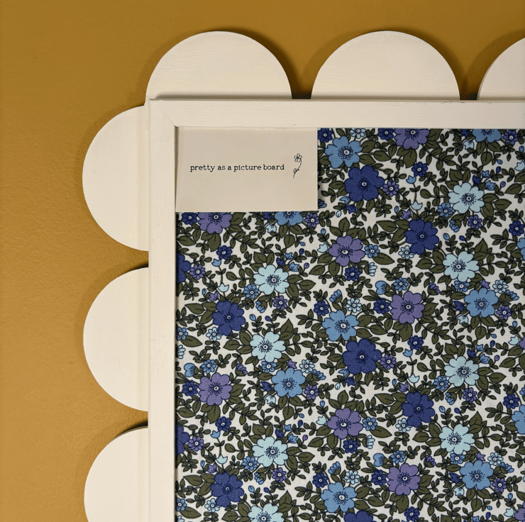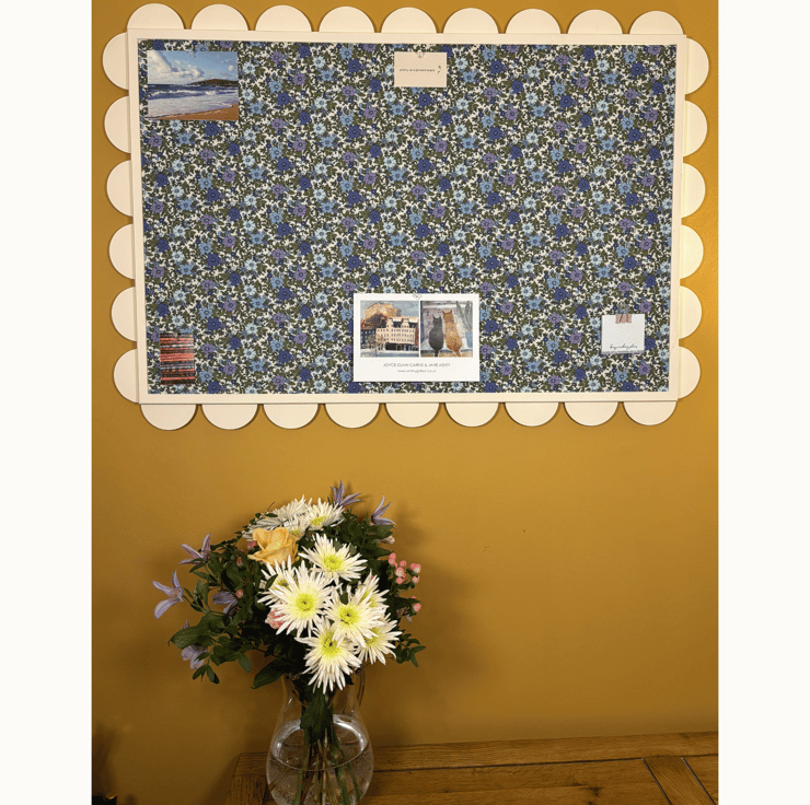 Oh my, this board is gorgeous, so strong and formal, with a slight edge of softness in the floral blues in the fabric, the qualities of which are found in its namesake, after whom it was named. Strong cream coloured wooden scalloped edges frame the bold blue floral fabric with hints of purple and lilac and make this board one which will help to elevate the room in which it is displayed and will transform your home into a sanctuary of sophistication and style!