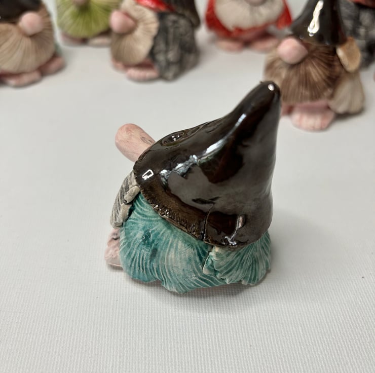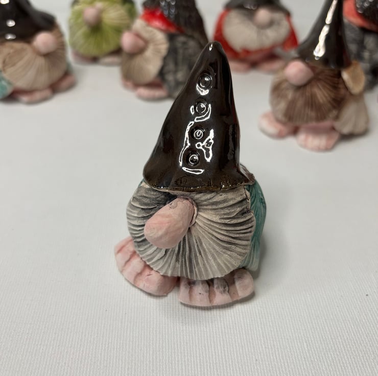 This is a cute little monk with a very shiny bronze hat! He stands 7 cm high and has an Oyster mushroom texture cloak. He obviously has a gaggle of little gonk friends behind him and I list a few of them.