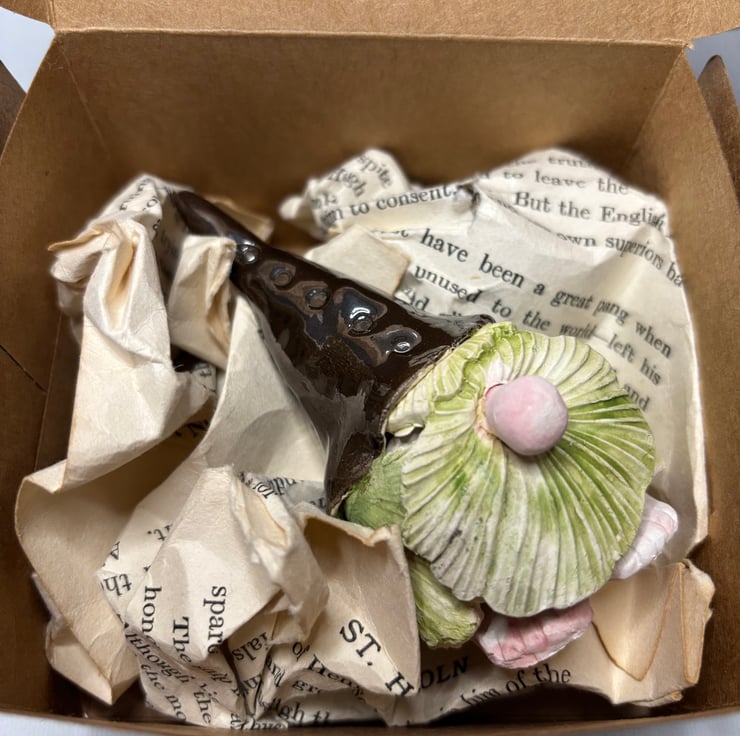 I package in a little box with a window and he will be hustled in recycled vintage book packaging.