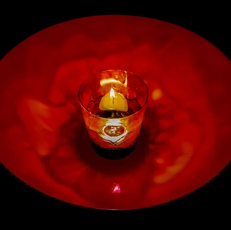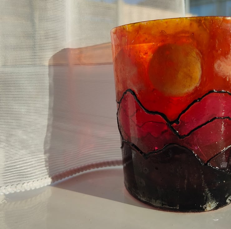 This candleholder is painted on a V-shaped glass, with a dark brown mountain range on the bottom, gradually reaching deep pink of top mountain range. Above there is transparent orange sky with opaque orange sun and clouds, unlined.