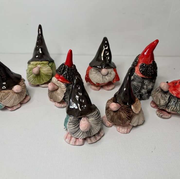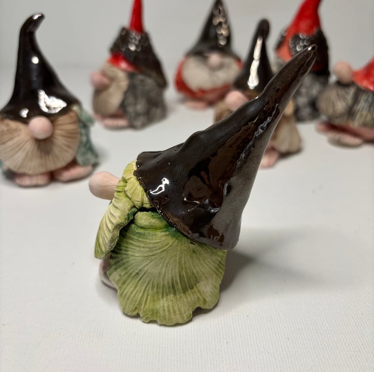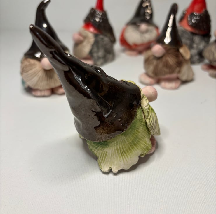 This is a cute little monk with a very shiny bronze hat! He stands 7 cm high and has an Oyster mushroom texture cloak. He obviously has a gaggle of little gonk friends behind him and I will list a few of them.