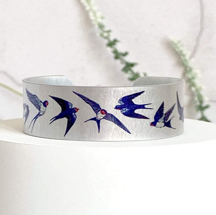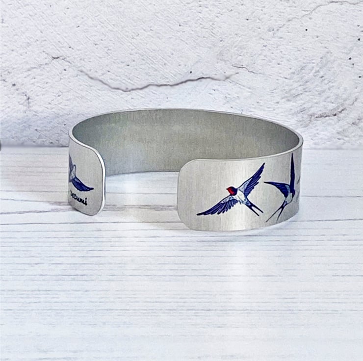 Cuff bracelet with a swallow design. Handmade metal bangle with flying swallows. Ideal gift for a bird lover.