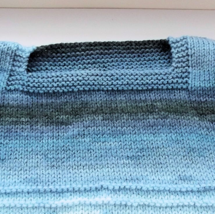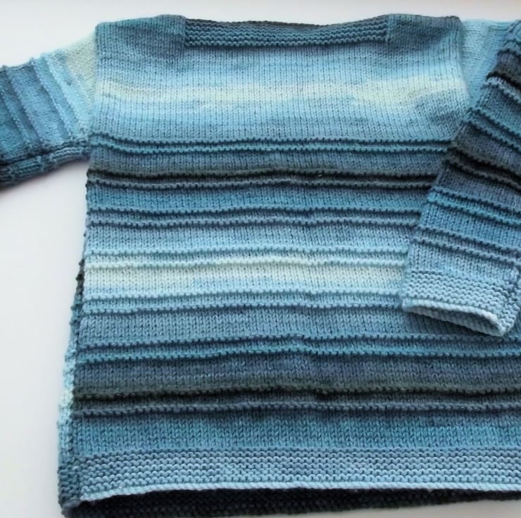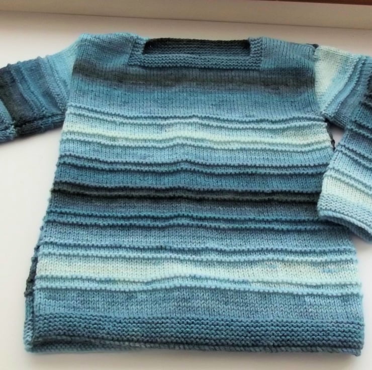 Hand knitted by me. White with Blue flecks Toddlers Jumper Sweater. Round neck with garter stitch pattern. Knitted in medium weight acrylic and wool blend yarn. hm150