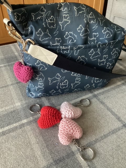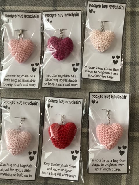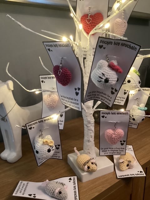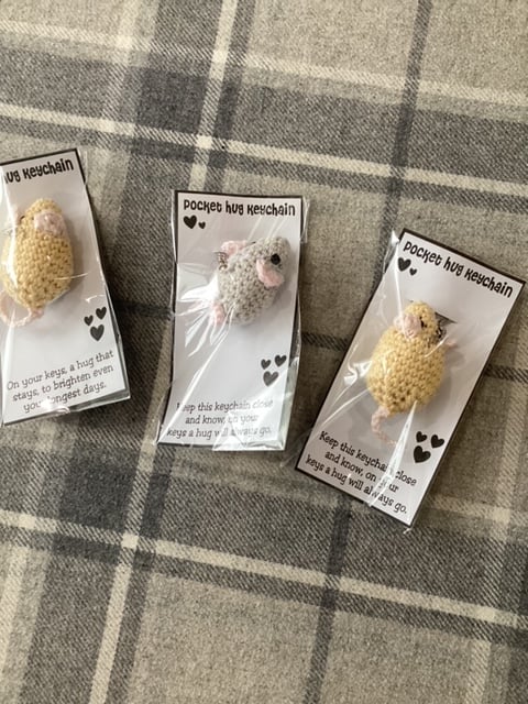 Pocket hug keychains, Hearts and Sugar Mice. all hand made crochet in Cotton Yarn, Polyester Filling, Safety Eyes, Key chain and additional charm.
