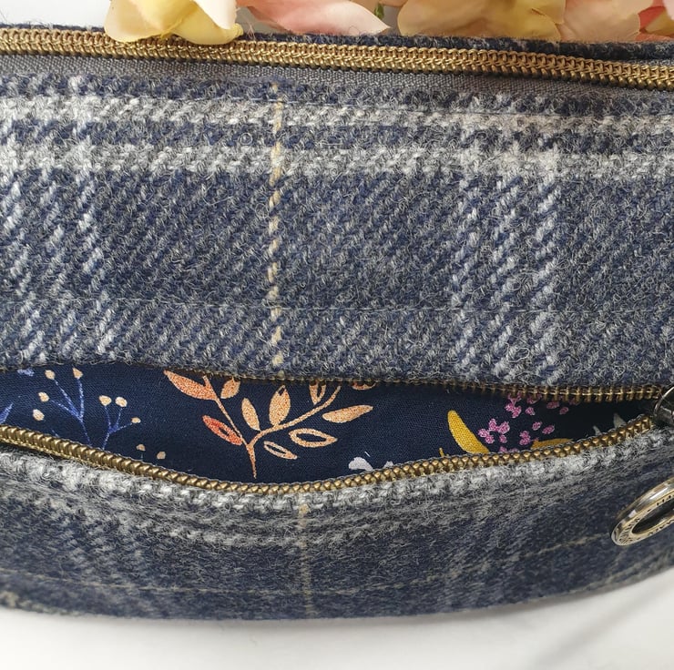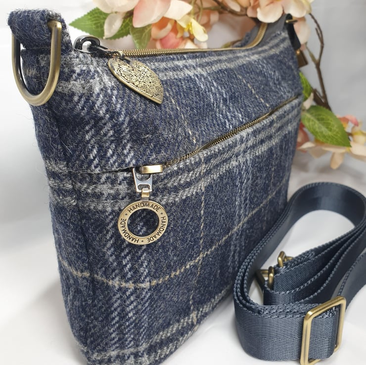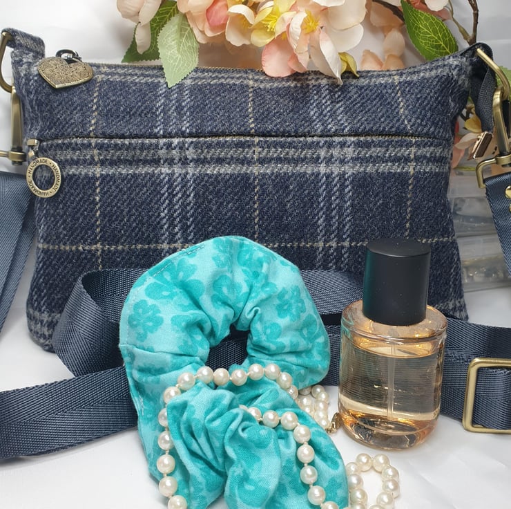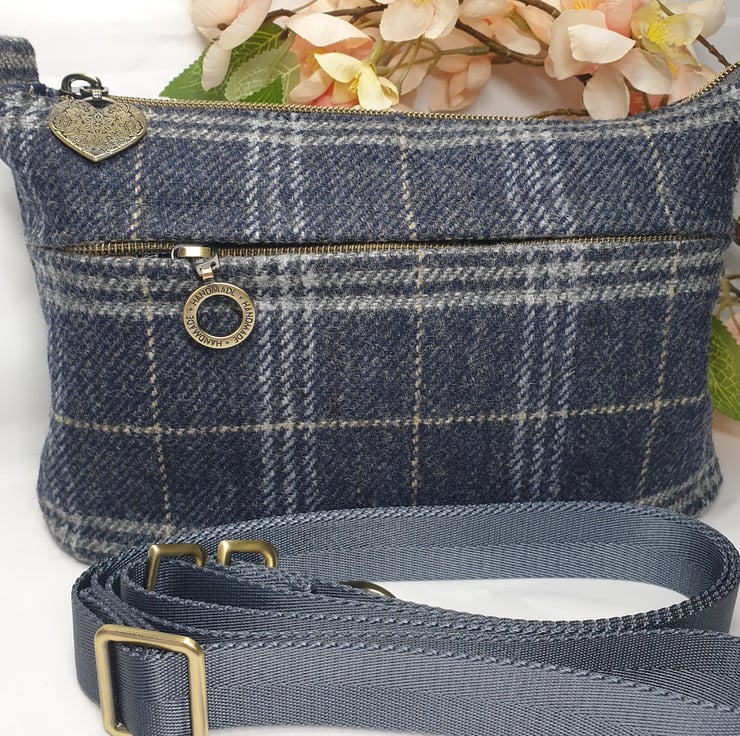 Beautiful Yorkshire tweed crossbody bag in North Water check (dark blue) with coordinating cotton lining. Wool is naturally renewable, biodegradable and recyclable.