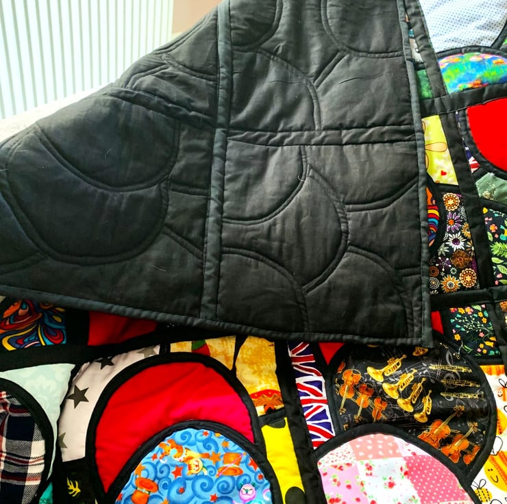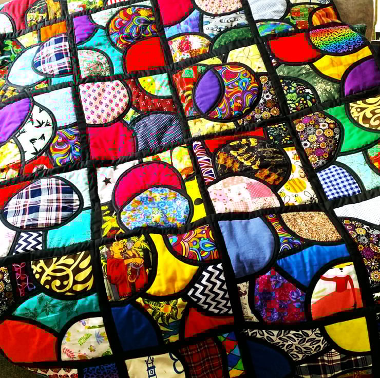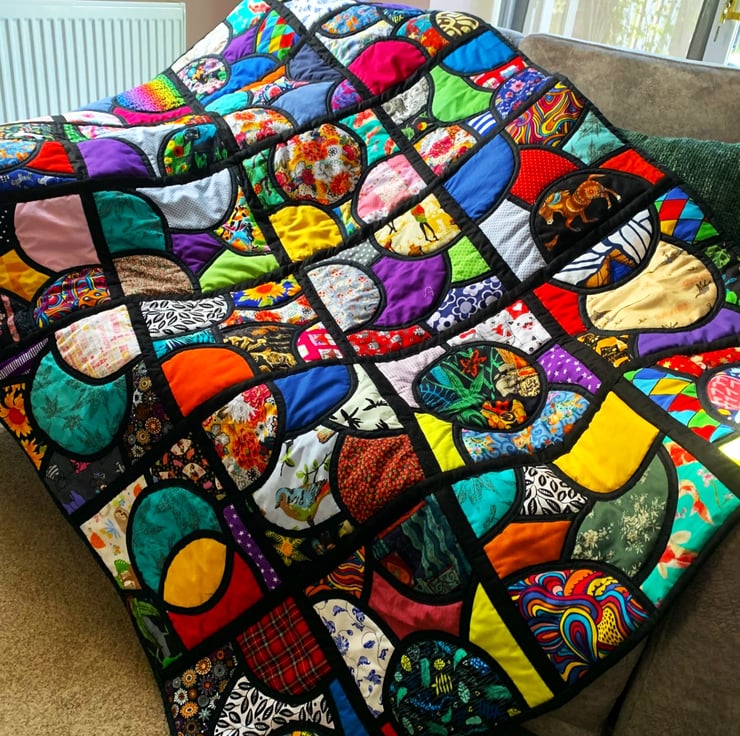 These quilts are a take on stained glass window, and are made from random remnants of cotton print and plain fabrics left from other projects, when you pay for material why throw away the left overs when they can be made into these lovely quilts they are colorful, unique one of a kind hand pieced stained glass window effect patchwork quilt all cotton fabrics with black bias binding , backed with a plain black cotton, and quilted, these are one off quilts no two are ever the same. and there is the satisfaction that the pieces they are made from never made it to land fill . the children spend countless hours playing I spy on these quilts as there are so many things from animals to cars etc to search for from all the different remnants used.