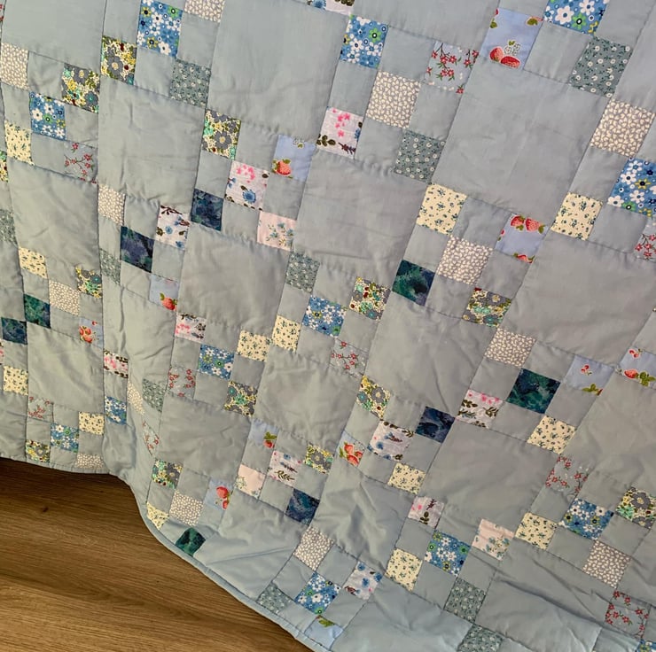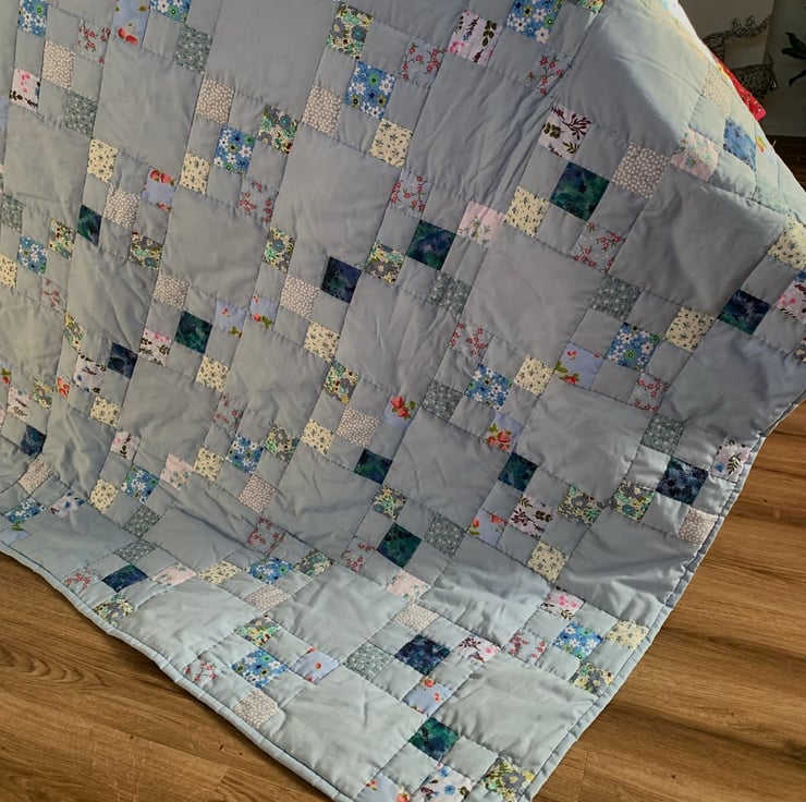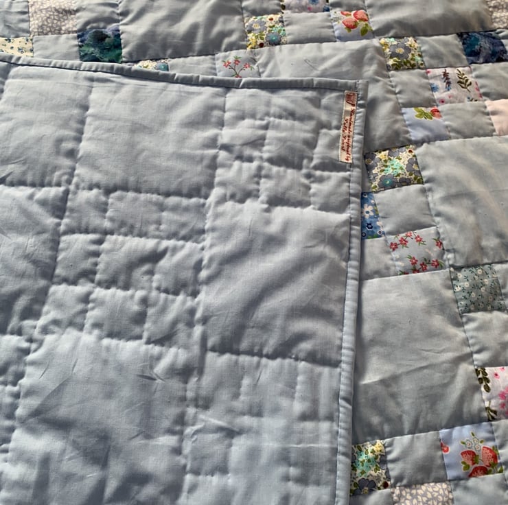 Calming Blues Nine patch traditional patchwork quilt blocks made in various blue cotton prints, and backed in a pale blue plain cotton , This quilt measures 50" X 72" and is machine washable , and will serve you well for many years to come