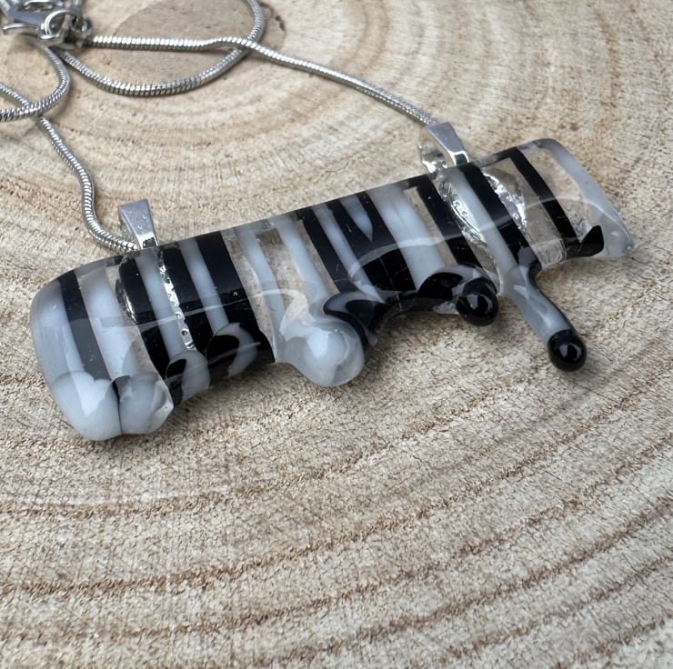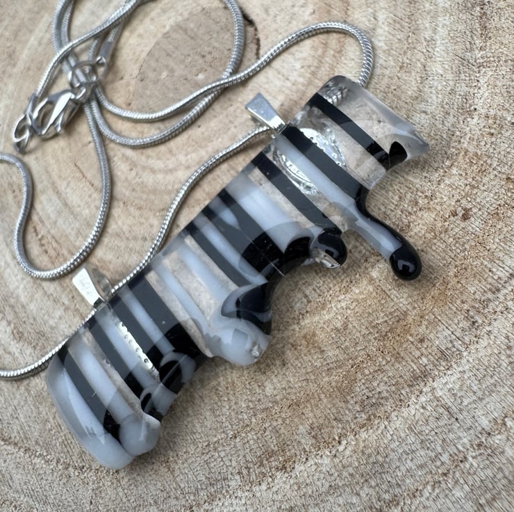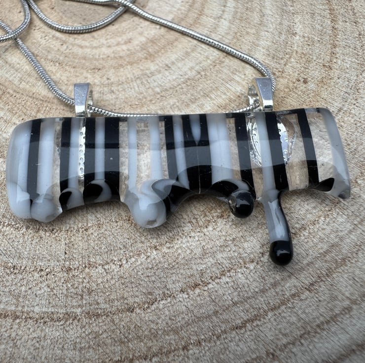 This beautiful handmade black and white striped fused glass pendant is a striking piece that combines bold design with elegant simplicity. The contrast between the rich black and crisp white stripes creates a modern, eye-catching pattern, making it a perfect accessory to elevate any outfit. The glass is carefully fused to create smooth, flowing lines, giving the pendant a polished and sophisticated finish. Whether paired with a casual outfit or added to a more formal ensemble, this pendant's timeless monochrome color palette and unique design make it a versatile and stylish choice for any occasion.
