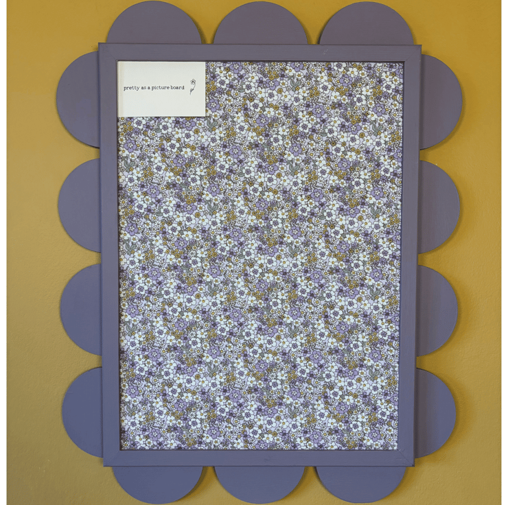 Named for our daughter's new girl kitten, The Rue is a beautifully handcrafted scalloped notice board, designed to bring both style and function into your home. Framed in a soothing dusky lilac, its refined curved edging creates a distinctive silhouette, whilst the delicate floral fabric offers a dreamy mix of lavender, ivory and golden hues. Whether you're displaying cherished photographs, handwritten notes, or creative ideas, this luxury notice board transforms any space into a chic and organised haven. The Rue seamlessly blends practicality with timeless beauty, making it a statement piece for those who adore thoughtful interiors.