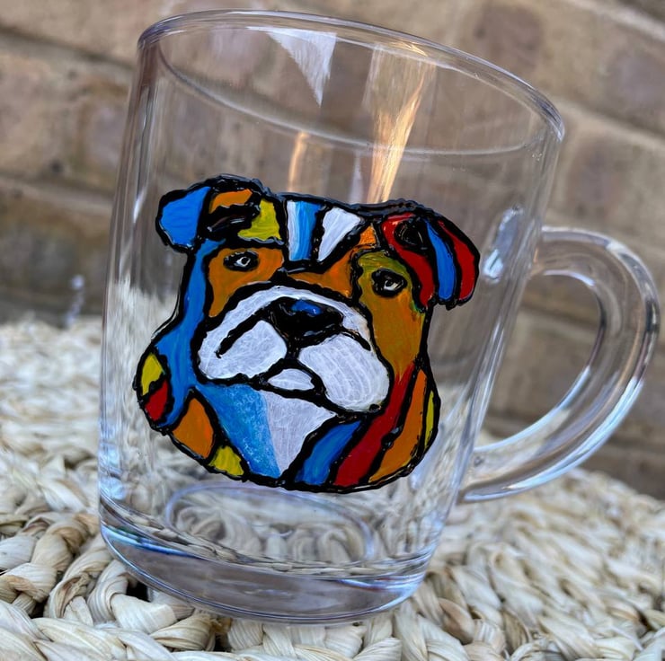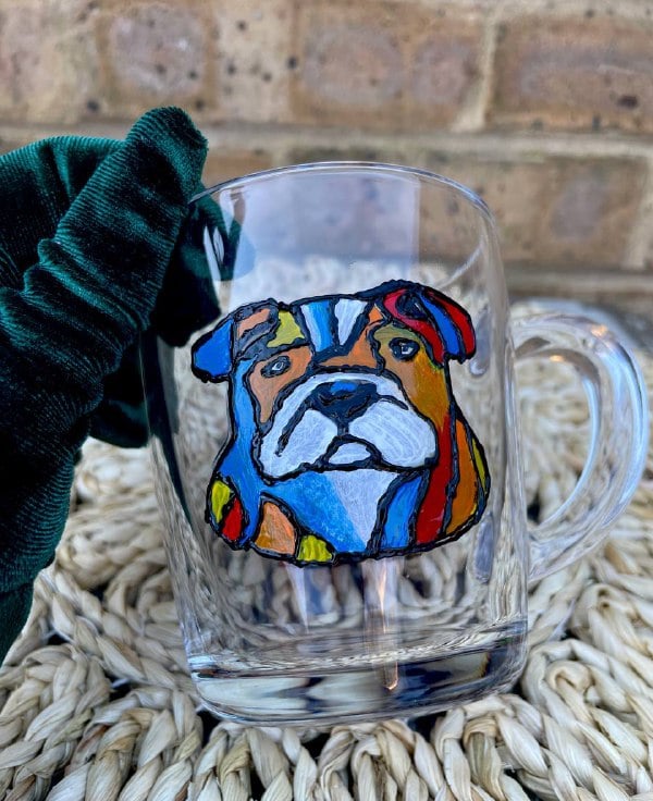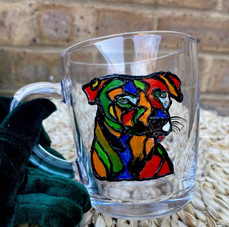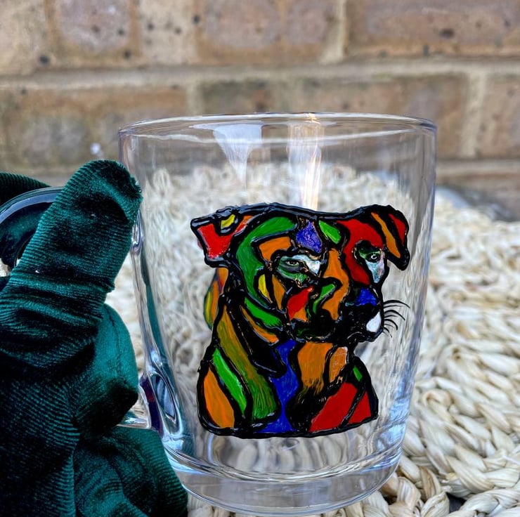 An incredibly stylish and unique handmade mug! The artistic hand-painted design in vibrant colors creates a stained-glass effect, adding a touch of exclusivity. Featuring a modern art-style dog illustration, this mug is a perfect gift for animal lovers and those who appreciate original tableware.