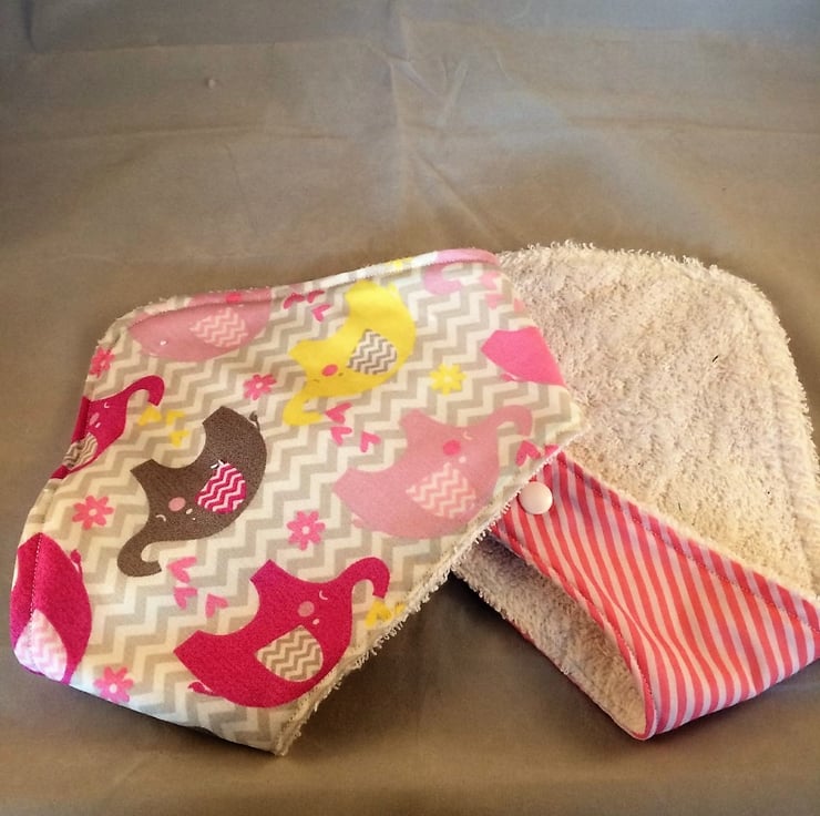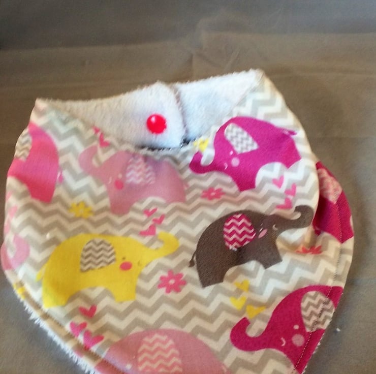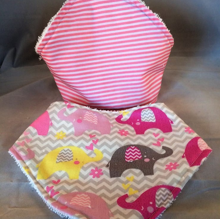 Pack of 2 Dribble bibs one elephant print and the other in a pinkk and white stripe cotton , snap fastener closure, the back is a thick terry toweling making then very absorbant and will help keep your little one dry.