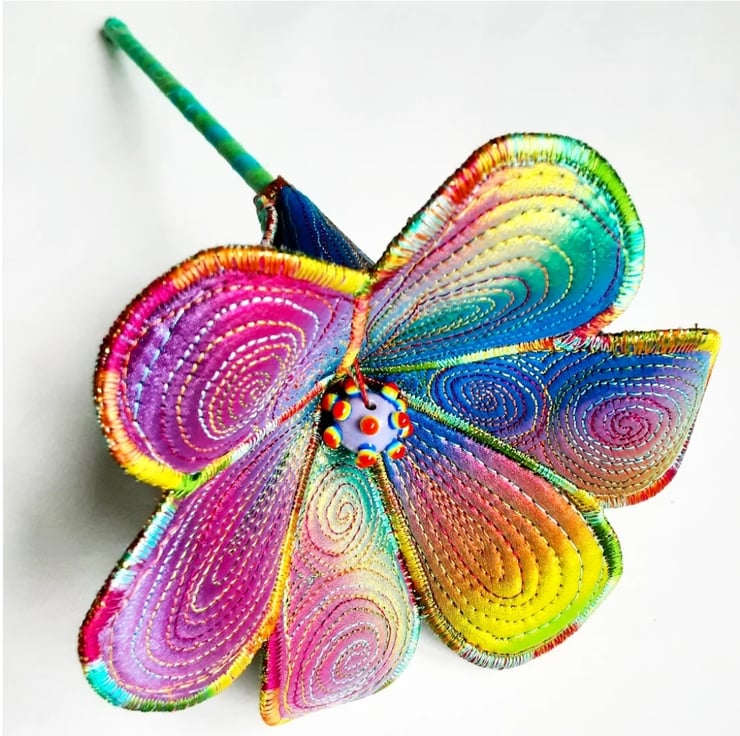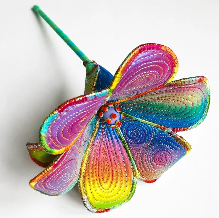 It has a flower with a rainbow glass bead in the middle, a green leaf coming out of the side and a wooden stem wrapped in green fabric.