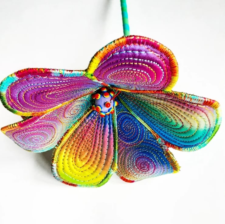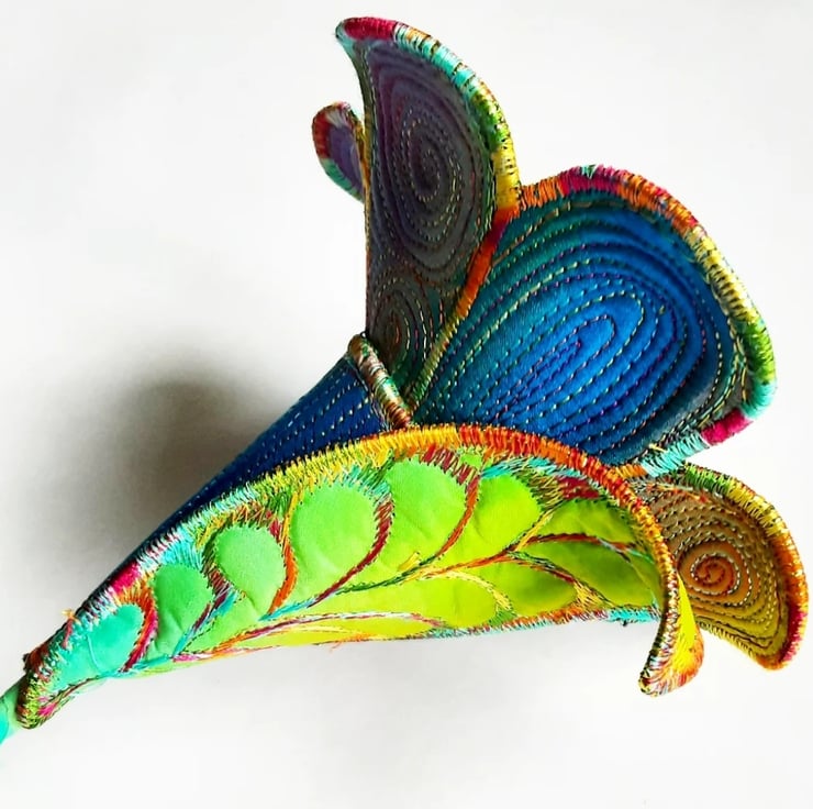 Made from layers of fabric including hand dyed Egyptian cotton and silk fabrics using the free machine embroidery style of sewing