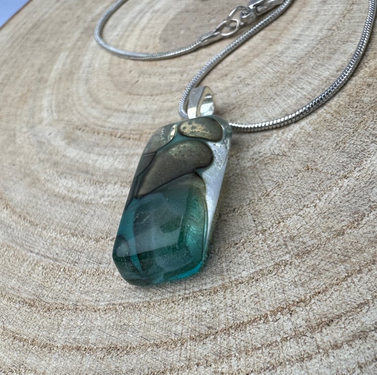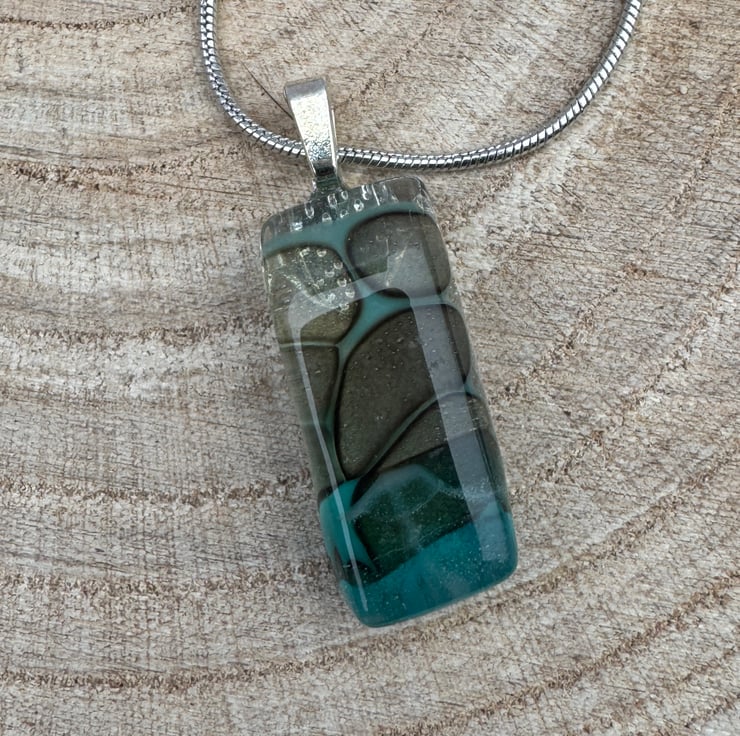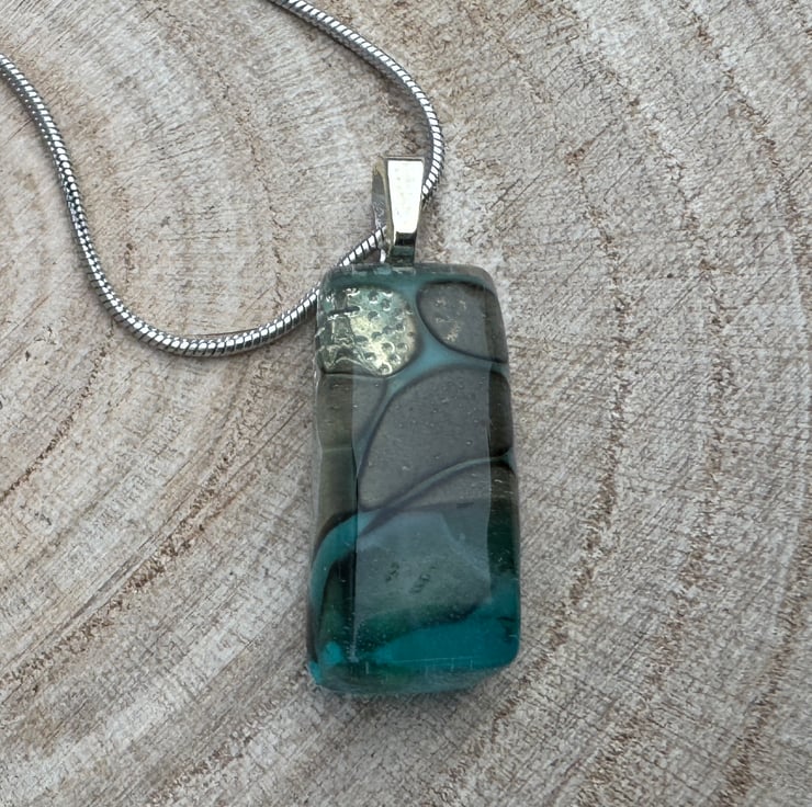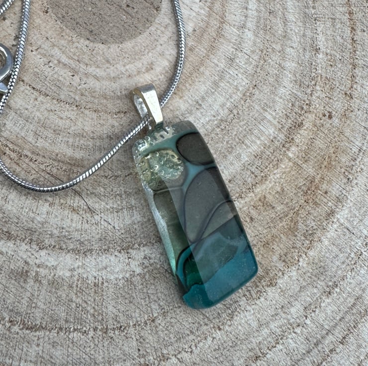 This beautiful handmade blue glass fused pendant is a captivating work of art that features mesmerizing swirls and waves, creating a dynamic and fluid design. The deep, rich blue tones swirl together with soft, flowing waves, evoking the serene beauty of the ocean or a calm, rippling lake. Each piece is individually crafted with care and precision, ensuring a one-of-a-kind design that reflects the natural movement of water. Whether you're drawn to its oceanic inspiration or simply its unique, vibrant aesthetic, this pendant is sure to add a touch of elegance and tranquility to any outfit. Lightweight and comfortable to wear, it’s perfect for both casual and formal occasions, making it a versatile and timeless addition to your jewelry collection.