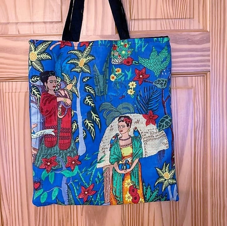 Frida Kahlo Tote bag.. Magdalena Carmen Frida Kahlo y Calderon was a Mexican painter known for her many portraits, self-portraits, and works inspired by the nature and artifacts of Mexico this charming tote measures 14" X 16" with 21" length handles so can be carried on your shoulder, is fully lined for stability in a plain black cotton, and has a small pocket on the inside