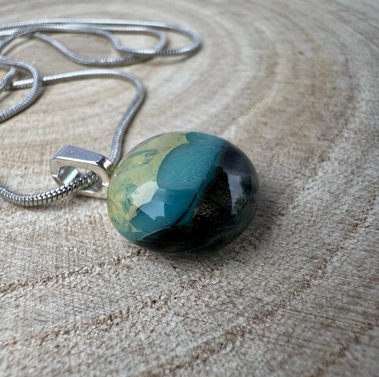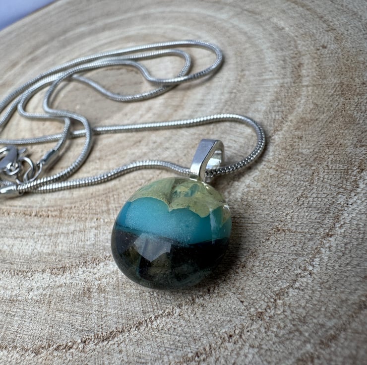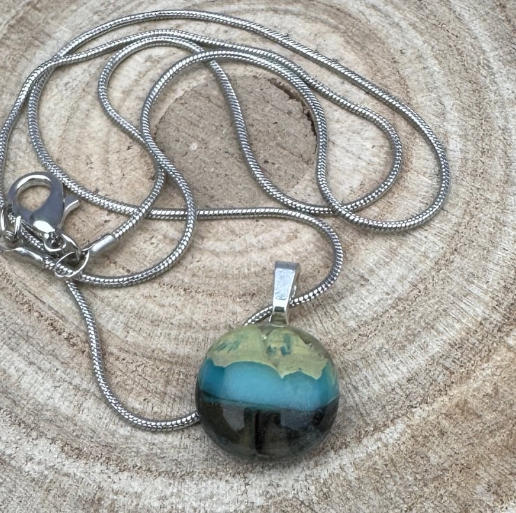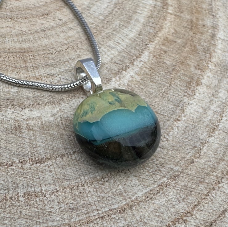 This beautiful handmade blue glass fused pendant is a captivating work of art that features mesmerizing swirls and waves, creating a dynamic and fluid design. The deep, rich blue tones swirl together with soft, flowing waves, evoking the serene beauty of the ocean or a calm, rippling lake. Each piece is individually crafted with care and precision, ensuring a one-of-a-kind design that reflects the natural movement of water. Whether you're drawn to its oceanic inspiration or simply its unique, vibrant aesthetic, this pendant is sure to add a touch of elegance and tranquility to any outfit. Lightweight and comfortable to wear, it’s perfect for both casual and formal occasions, making it a versatile and timeless addition to your jewelry collection.