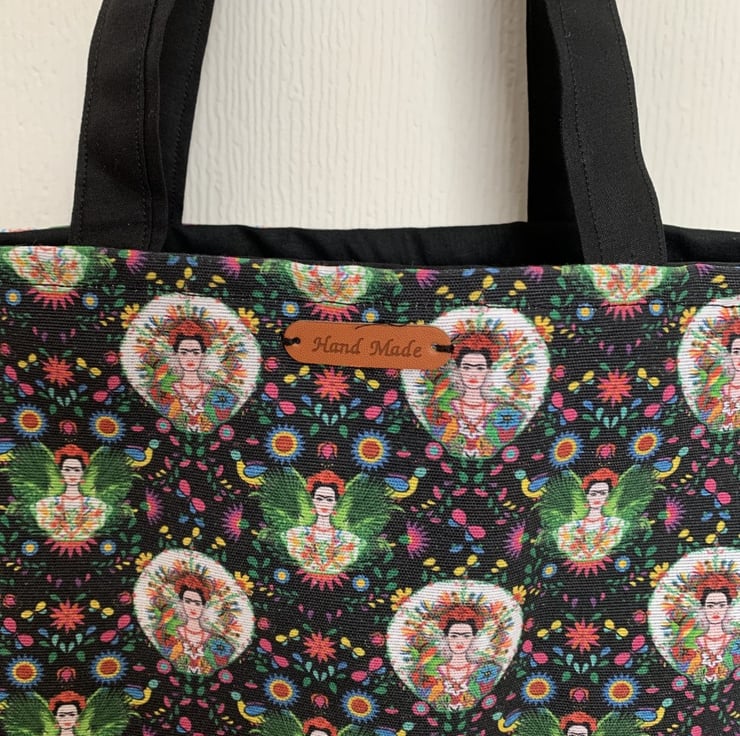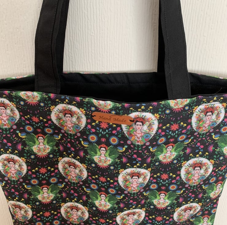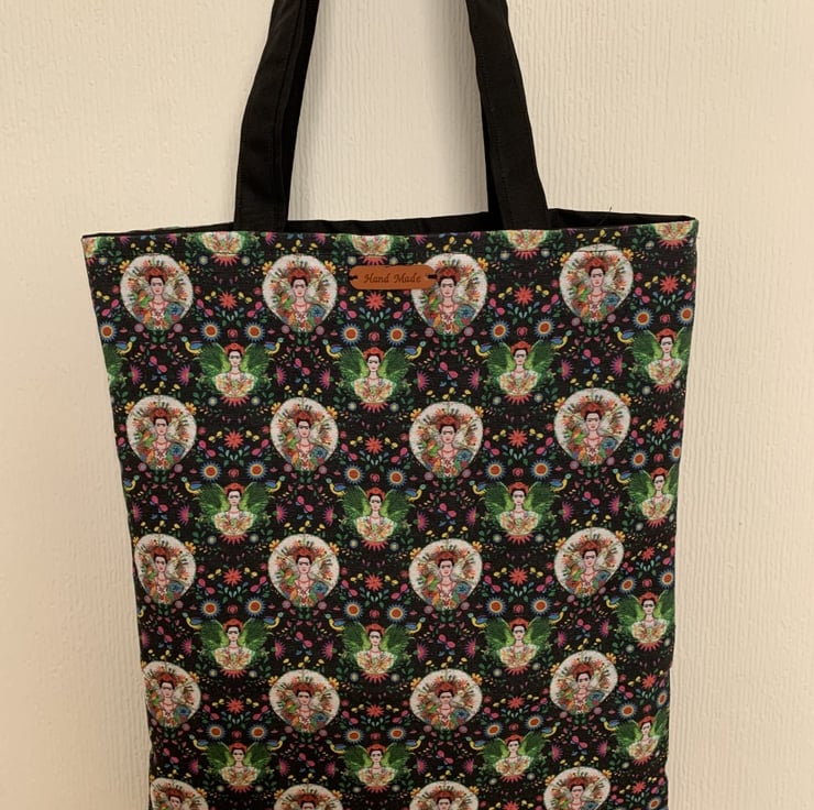 Frida Kahlo printed 100% cotton canvas tote bag measures 14" X 16" with 21" length handles so can be carried on your shoulder, is fully lined for stability in a plain black cotton. Ideal for shopping, books etc .