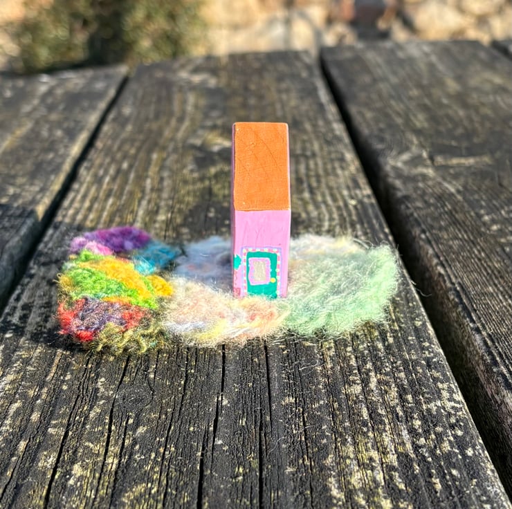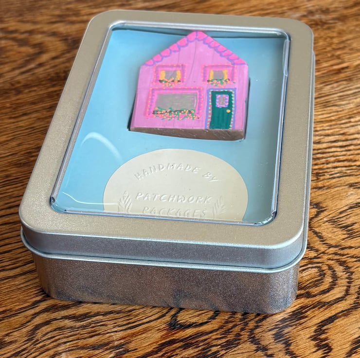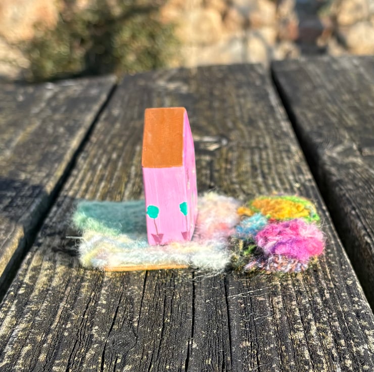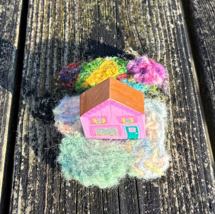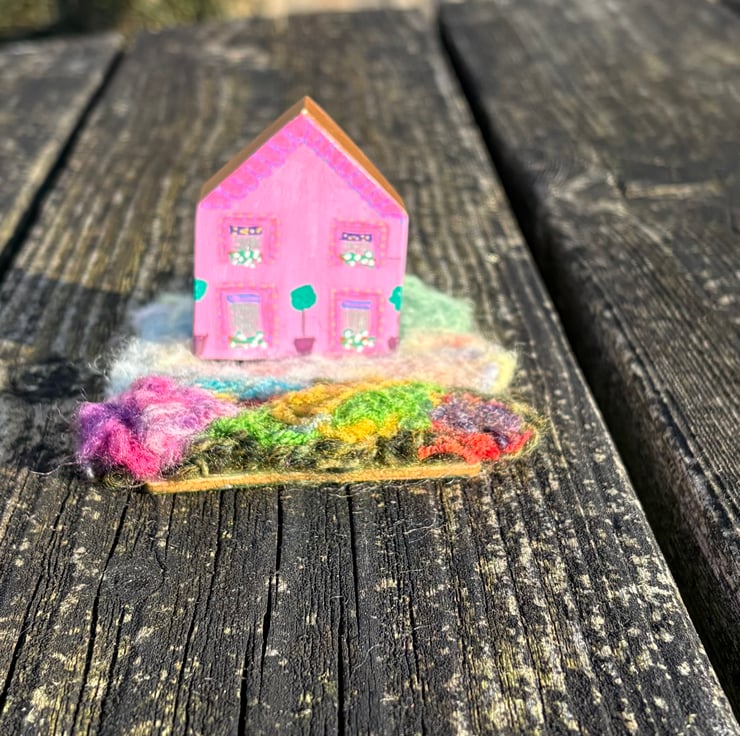 The house is a hand painted wooden block painted on all sides and sits in a needle felted garden on a thin plywood sheet creating a 3 dimensional piece which can be viewed from all sides.