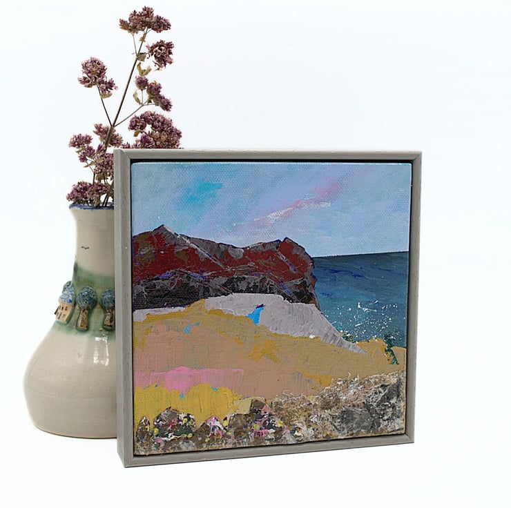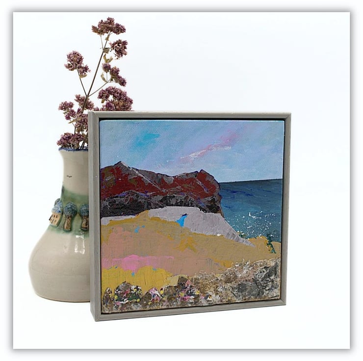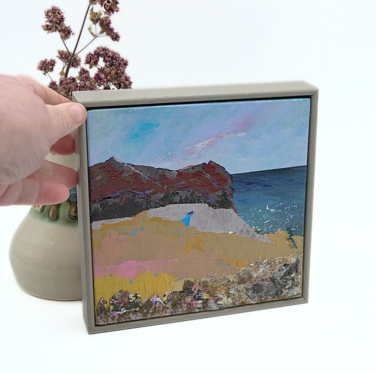 This is a small Scottish coastal landscape artwork. The sky is a bright blue which contrasts with the deep blue-greens of the sea. The water is relatively calm but there is some sea spray which offers a warning of the power of the sea. The cliffs and sand are brighter which gives a sense of security and safety. In the foreground we can see rocks and stones. The artwork is presented in a contemporary grey, wooden frame.