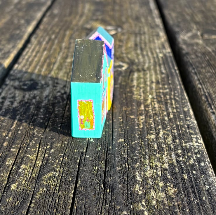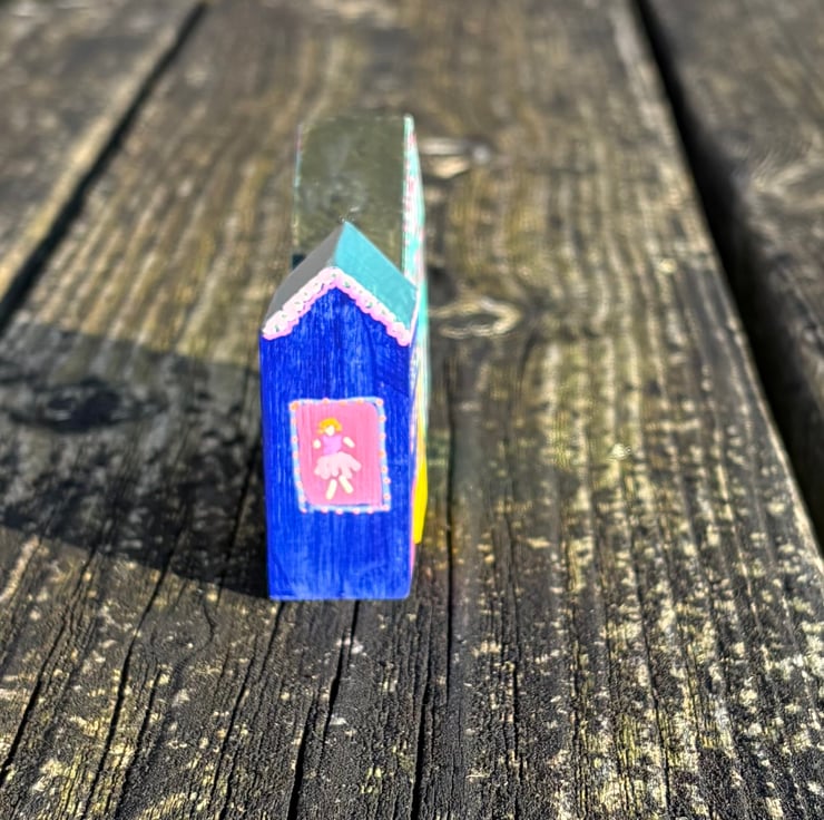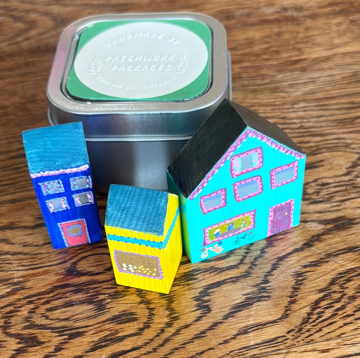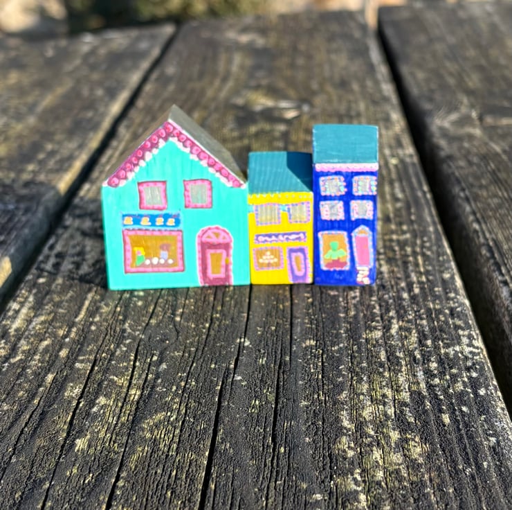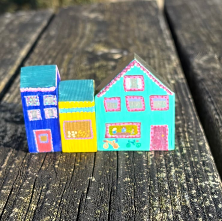 The shops are hand painted wooden blocks painted on all sides creating a 3 dimensional piece which can be viewed from all sides.
