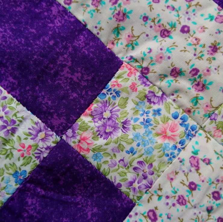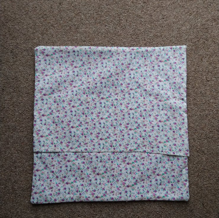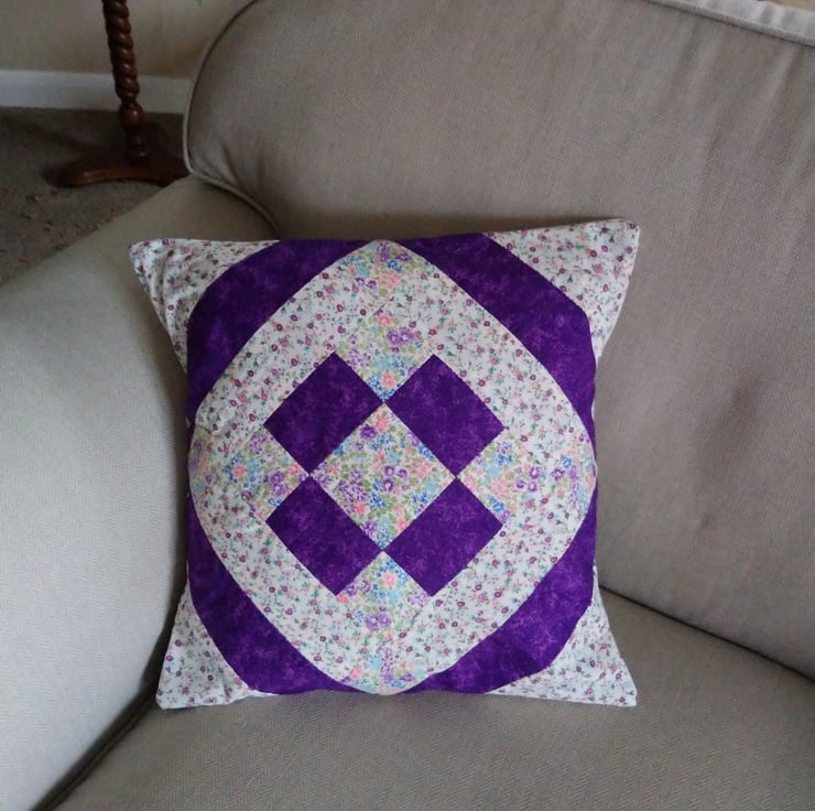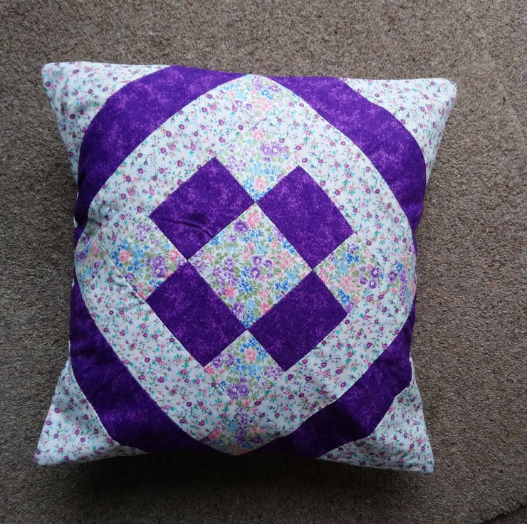 Handsewn patchwork cushion cover in three different fabrics, a rich two tone purple, and two pretty floral materials. The reverse is in one of the floral fabrics, and has a wrapover opening for insertion of the cushion pad (not included)