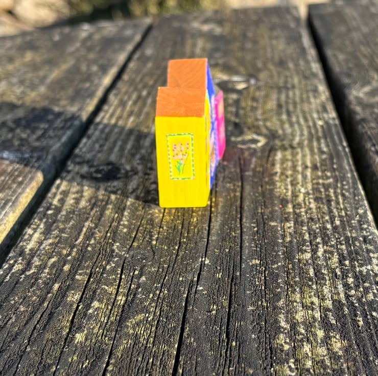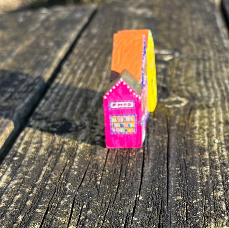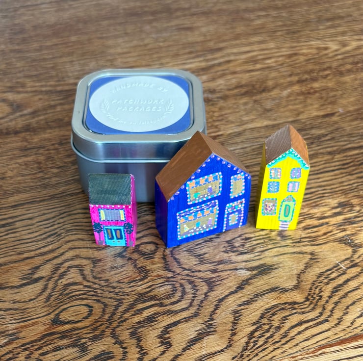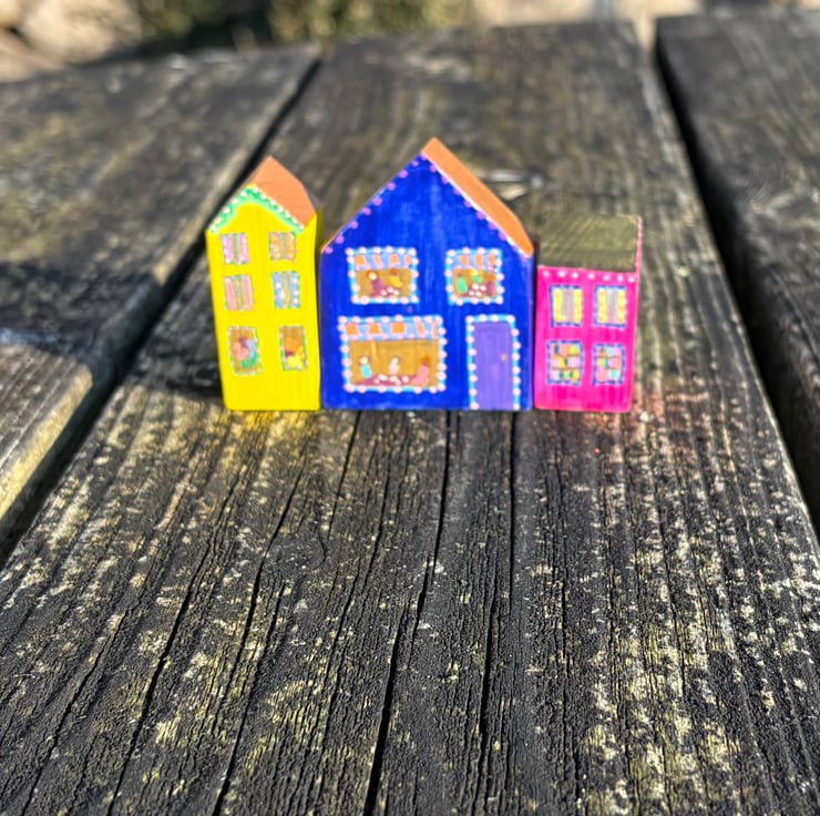The shops are hand painted wooden blocks painted on all sides creating a 3 dimensional piece which can be viewed from all sides.