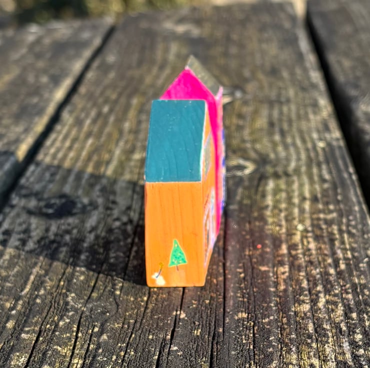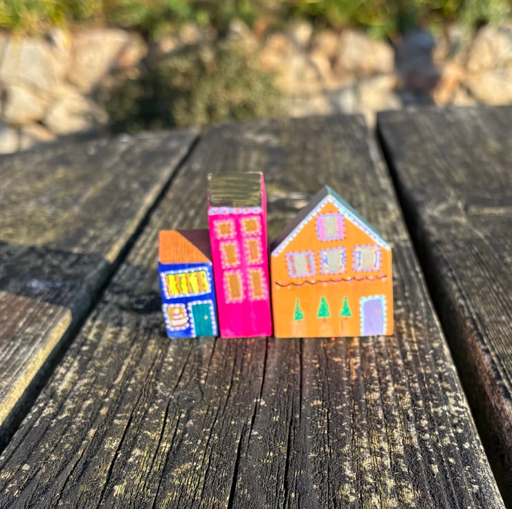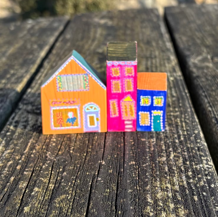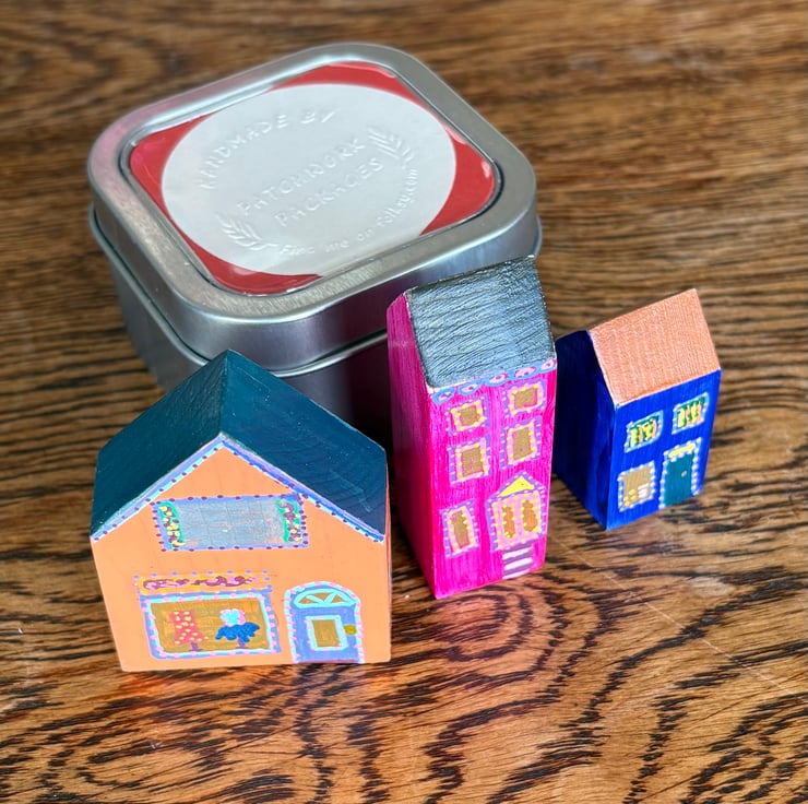 The shops are hand painted wooden blocks painted on all sides creating a 3 dimensional piece which can be viewed from all sides.