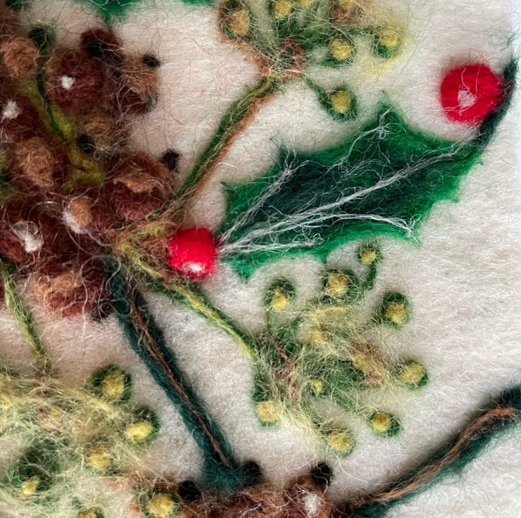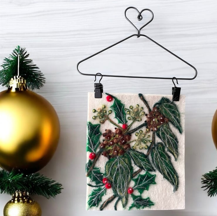 Each of my felted pieces is inspired by the wildlife and landscape around the UK. This holly, ivy & berry piece celebrates the festive foliage that lines hedgerows during winter.