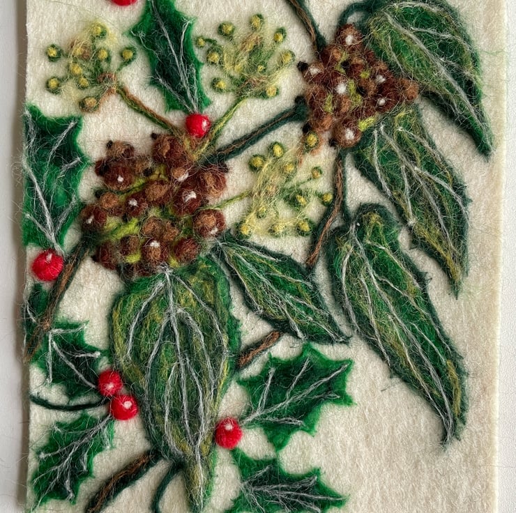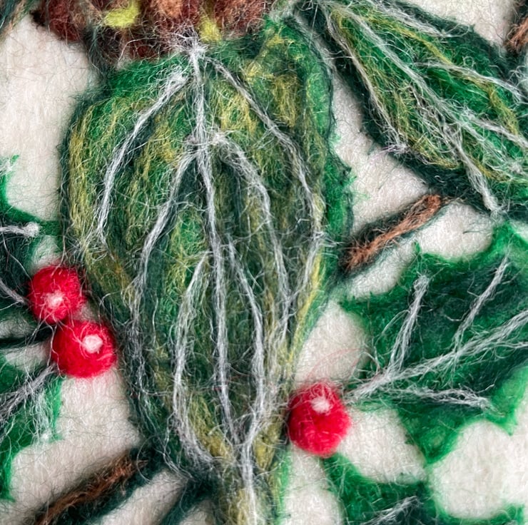 A hand-felted holly, ivy & berries artwork crafted from merino fleece.