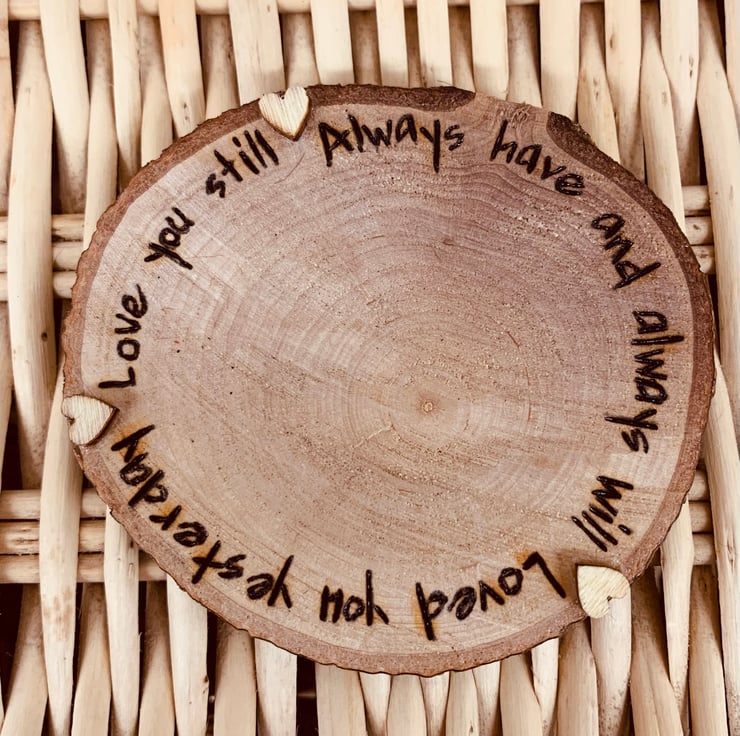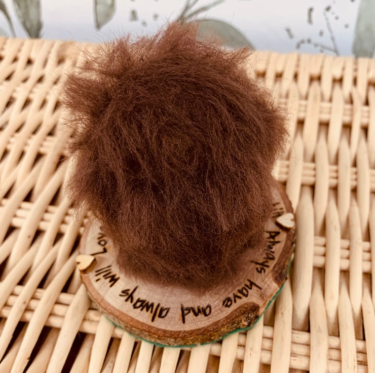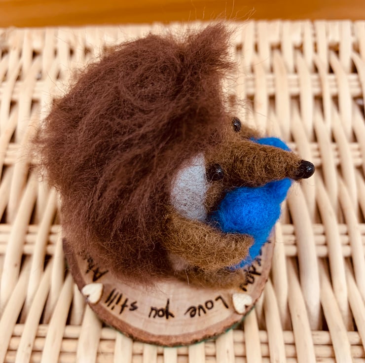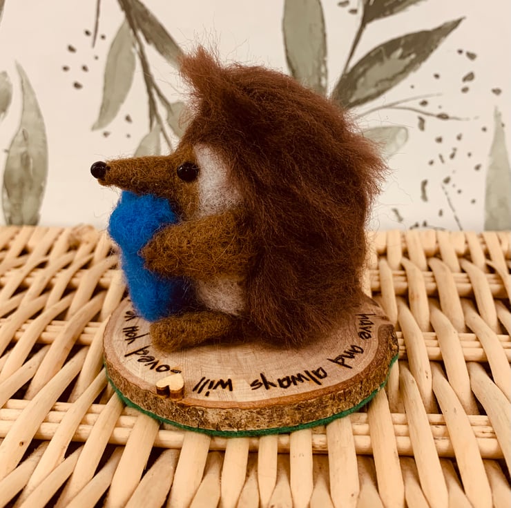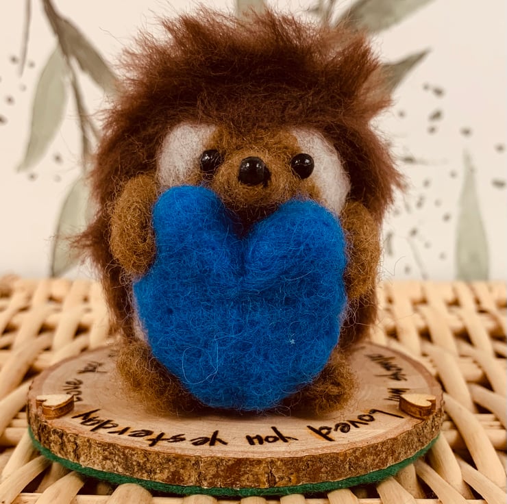 A needlefelted love struck hedgehog, clutching a blue heart to his chest, and mounted on a felt based wood slice with the words ‘loved you yesterday, love you still, always have and always will’ burned around the edge with hoggie in the centre. Beautiful gift for your Valentine, or at any time for the one you love. Not a toy, collectors item only
