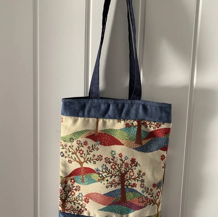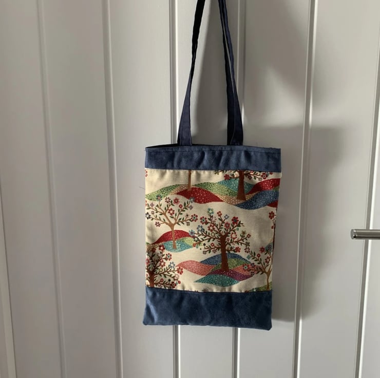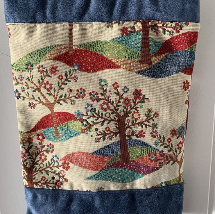 Tapestry tree of life tote with blue faux suede borders at top and botton, shoulder straps , fully lined in Navy blue cotton