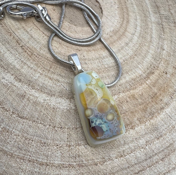 Add a touch of elegance and artistry to your jewellery collection with this handcrafted fused glass pendant, featuring a stunning blend of cream, bronze, and pale blue hues. Each piece is carefully kiln-fired to achieve a smooth, glossy finish, creating a unique interplay of colors reminiscent of warm skies and autumnal foliage.