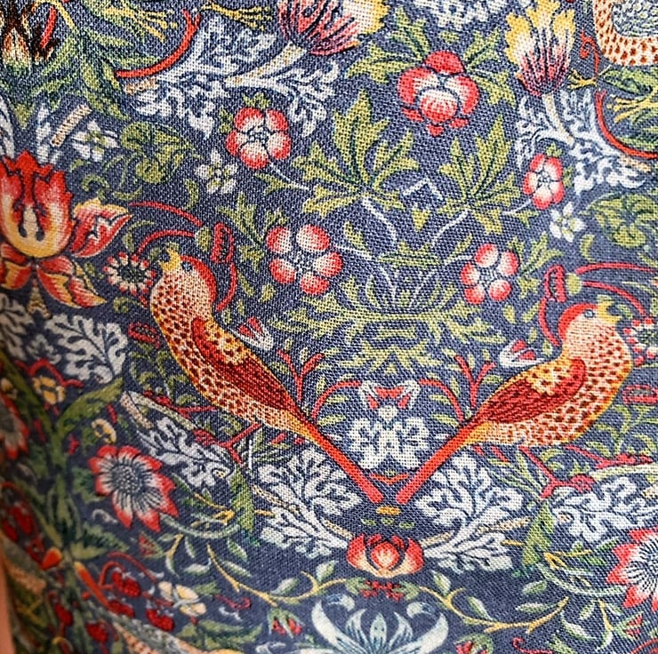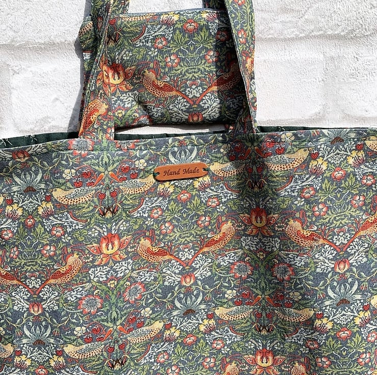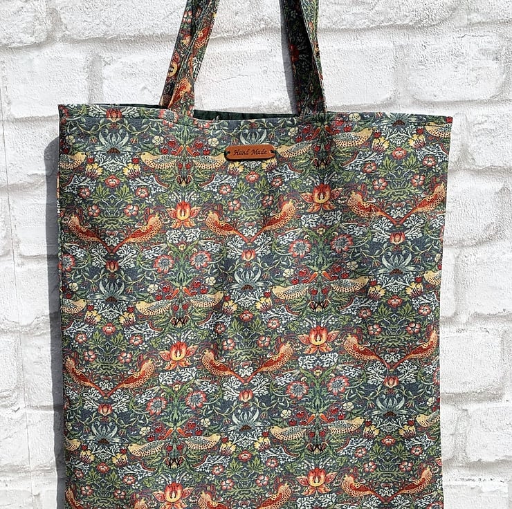 The strawberry thief by William Morris 100% cotton tote bag measures 14" X 16" with 21" length handles so can be carried on your shoulder, is fully lined for stability in a bottle green cotton cotton. Ideal for shopping, books etc etc comes with a matching free coin purse which is also fully lined.
