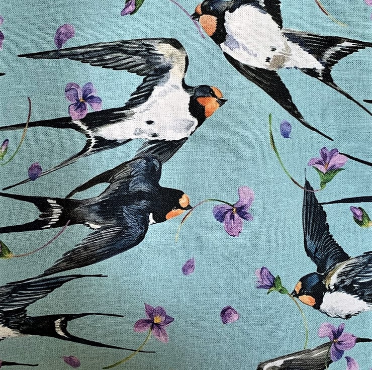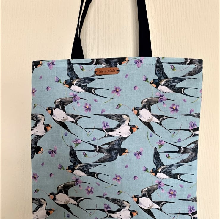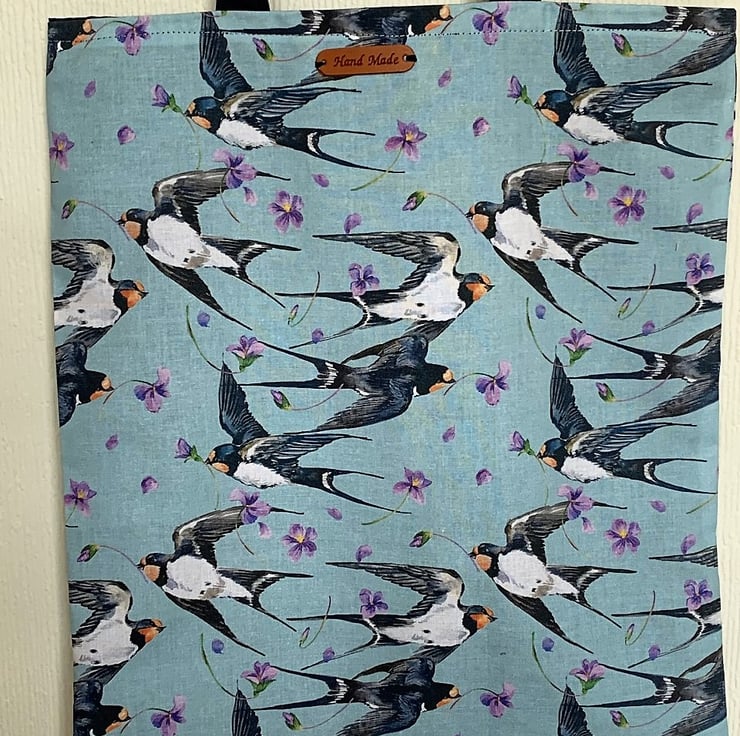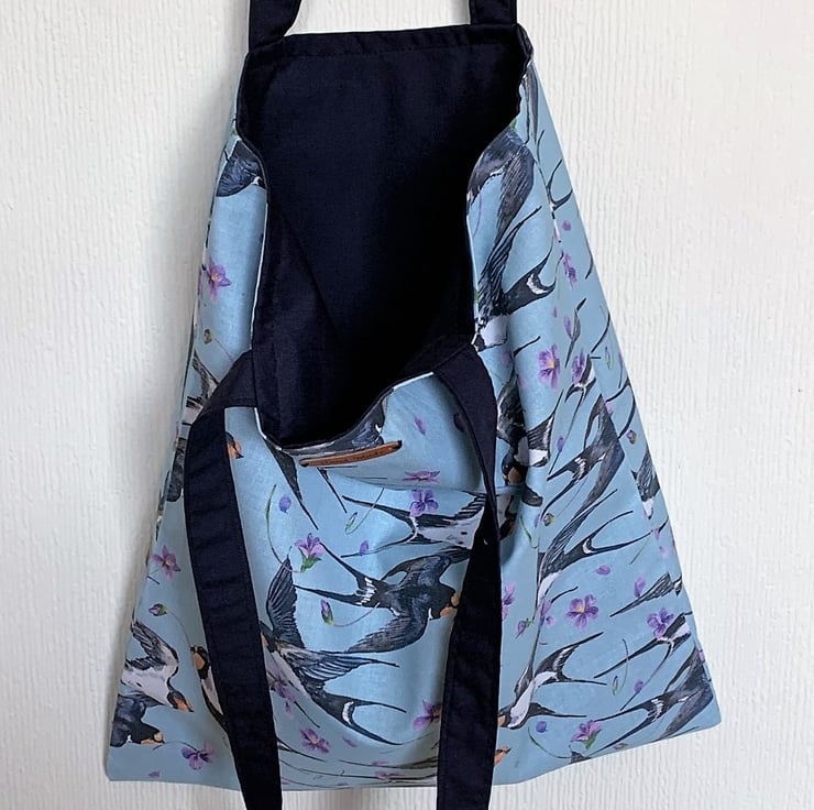 This charming tote in a cooton linen of swallows on a blue background measures 14" X 16" with 21" length handles so can be carried on your shoulder, is fully lined for stability in a plain navy blue cotton.