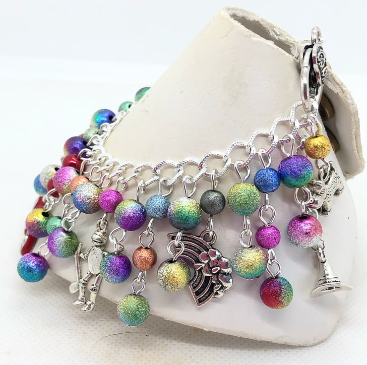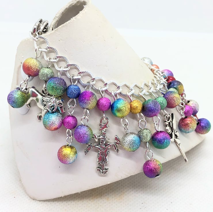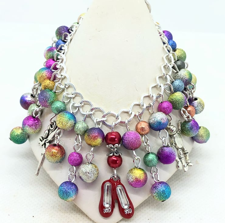 Created using lion, scarecrow, fairy, red slippers, Tubman, rainbow, dog & witches hat charms with rainbow stardust beads.