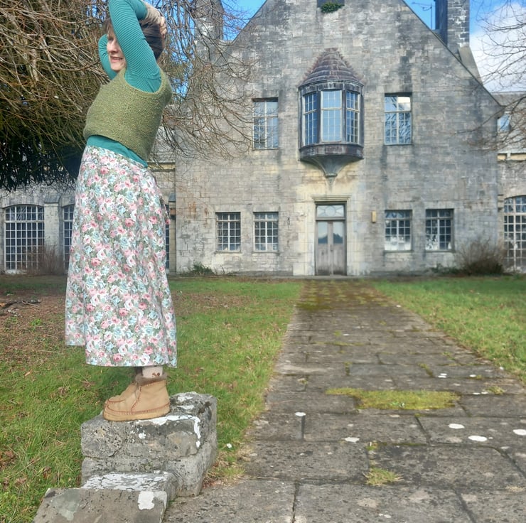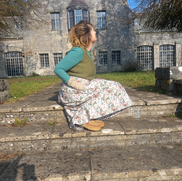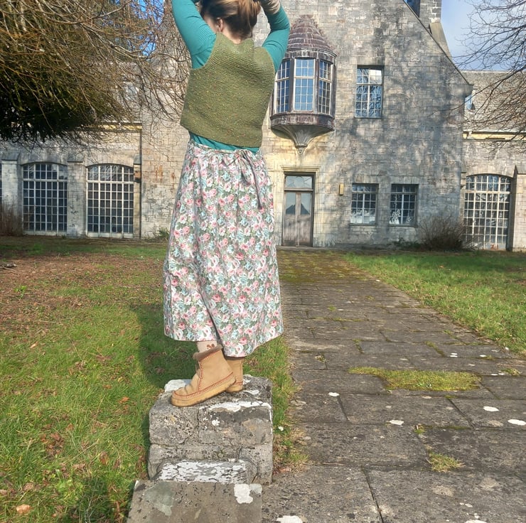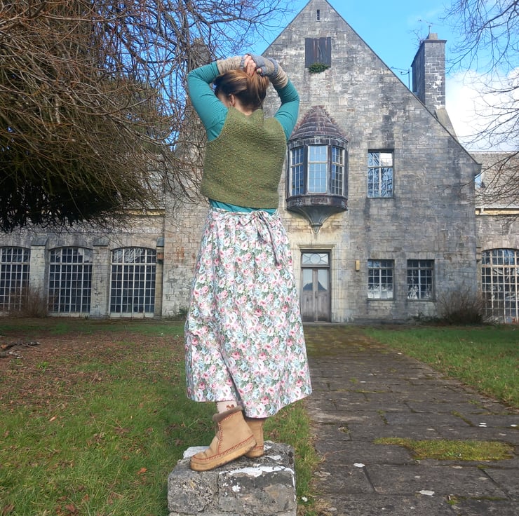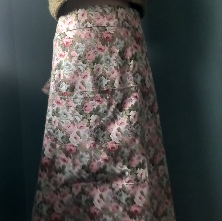 This handmade skirt, made from my own pattern so fits multiple sizes, pulls together at the back tying with a bow. Looks fab with a lace petticoat and boots. All seams are overlocked on the inside. Fits from a 10 a 16. This one is a beautiful rose fabric from the waist band to the hem 31 Inc.