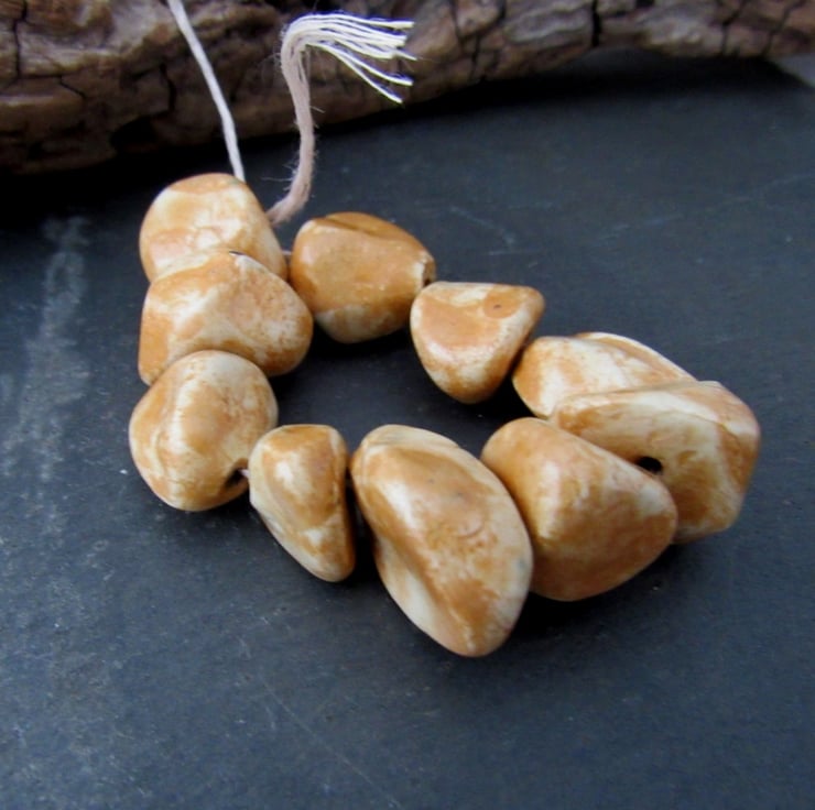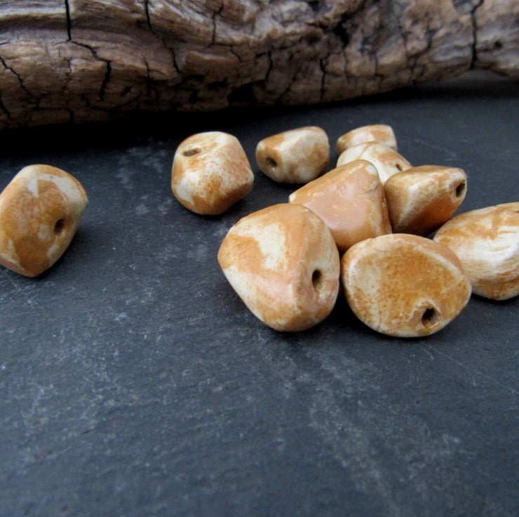 10 Small Pale Brown Glazed Nugget Pebble Clay Beads