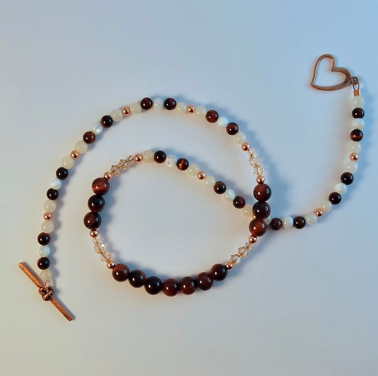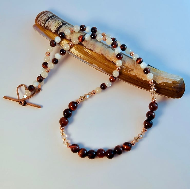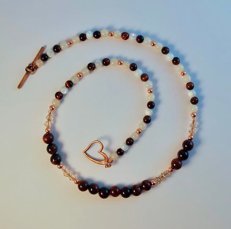 The necklace graduates to 4mm beads of red Tiger Eye, pale peach Mashan Jade and white Mother of Pearl, embellished with 3mm copper spacers.