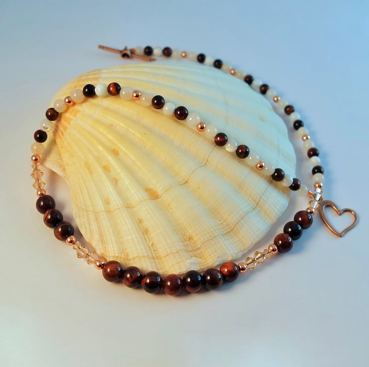 Red Tiger Eye has the same chatoyancy as yellow Tiger Eye, but is a rich, dark, red-brown colour, enhanced here by the sparkle of crystal and the warmth of copper.