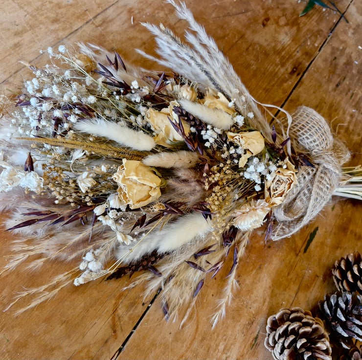 A large hand tied bunch of dried Roses, Grasses, Gypsophila, Nigella Seed Heads & more. All in Creams & Whites. Perfect for a vase or to hang on the wall. Size 50cm x 25cm. Commissions are welcome. Any questions please feel free to ask.
