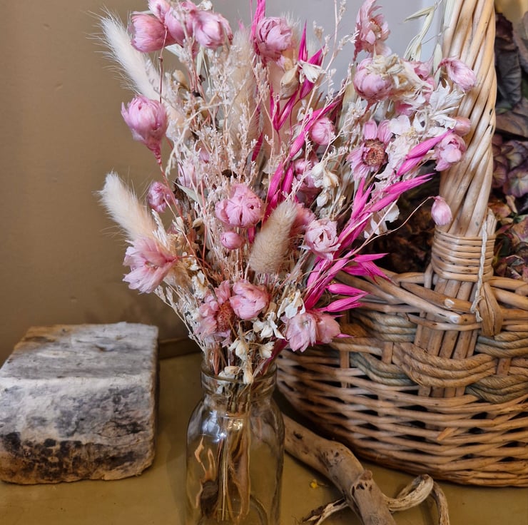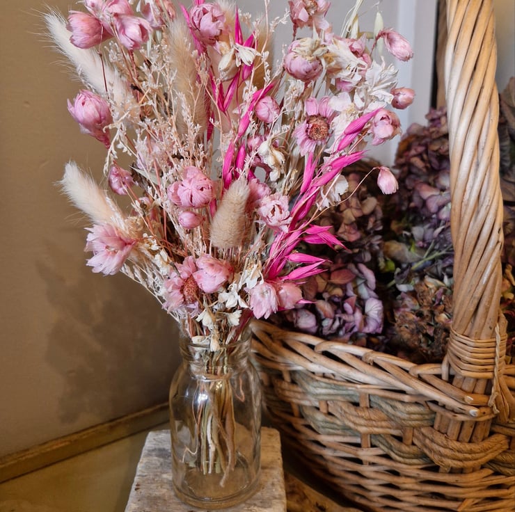 A delicate tied bunch of pretty pink dried Rodanthe Daisies & Grasses complete with Glass Posy Vase. Perfect for a gift. Size 30cm high x 18cm wide.