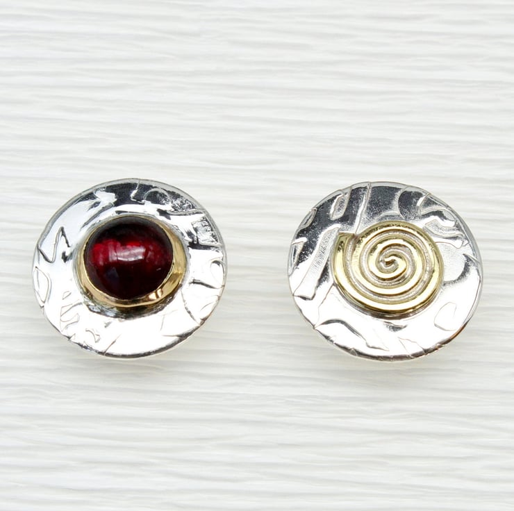 These handmade, round sterling silver ear studs are asymmetrical. One features a wonderful garnet gemstone, and the other has a swirl of brass decoration. Our unique pattern has been hand-embossed into the silver to create an interesting surface design. The studs measure 13mm in diameter, and the ear backs and posts are sterling silver. As each pair is handmade, the pattern may vary slightly from the ones shown in the images.