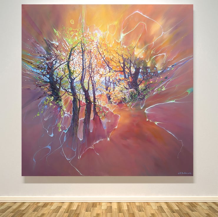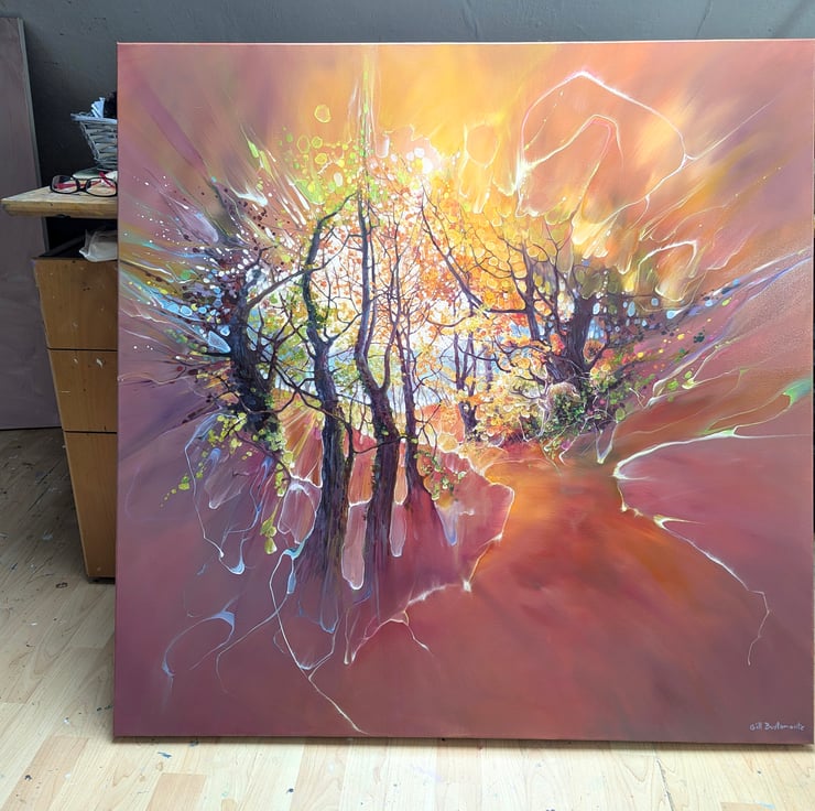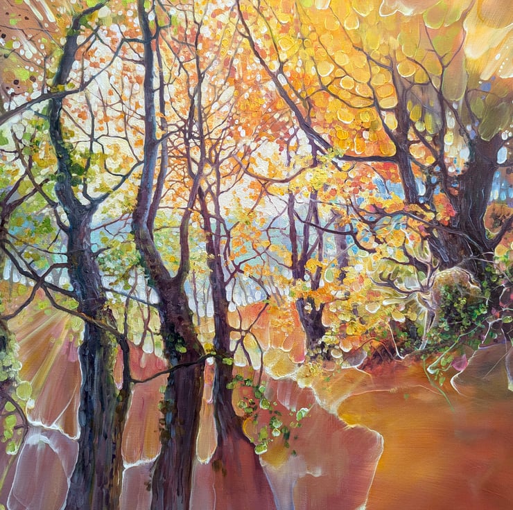 The Wild Wild Wood is a semi abstract, art nouveau style painting of an autumn wood and a deer buck. It is 40x40 inches. The painting shows the view through trees on a path in a wood. There are a myriad of vibrant autumn colours and the patterns and curves created by the tree branches are quite art-nouveau in effect. There is a fallow deer buck emerging from branches and the hint of a path and other trees and a clearing beyond. I have tried to express the energy and colour explosion of a woodland by using just enough realism to show what the idea is. And the idea is how much there is to look at in a wood and how this can be expressed without painting every leaf and twig! The painting was inspired by many walks in ancient woodland and the thrill I get whenever I spot deer. Even though it is common to spot them, I still love these creatures and feel they are the real owners of trees and forests and should be respected. There is more story to this painting but viewers are free to make their own up. Painted on orange edged canvas, no frame needed, ready to hang and comes with certificate of authenticity from the artist.